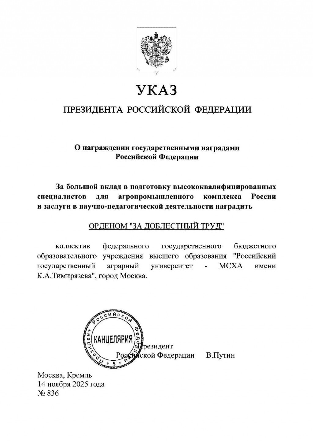 Эта высокая оценка труда всего коллектива – преподавателей, ученых, сотрудников, студентов и выпускников – подтверждает стратегическую значимость академии для обеспечения продовольственной безопасности и экономического суверенитета страны.