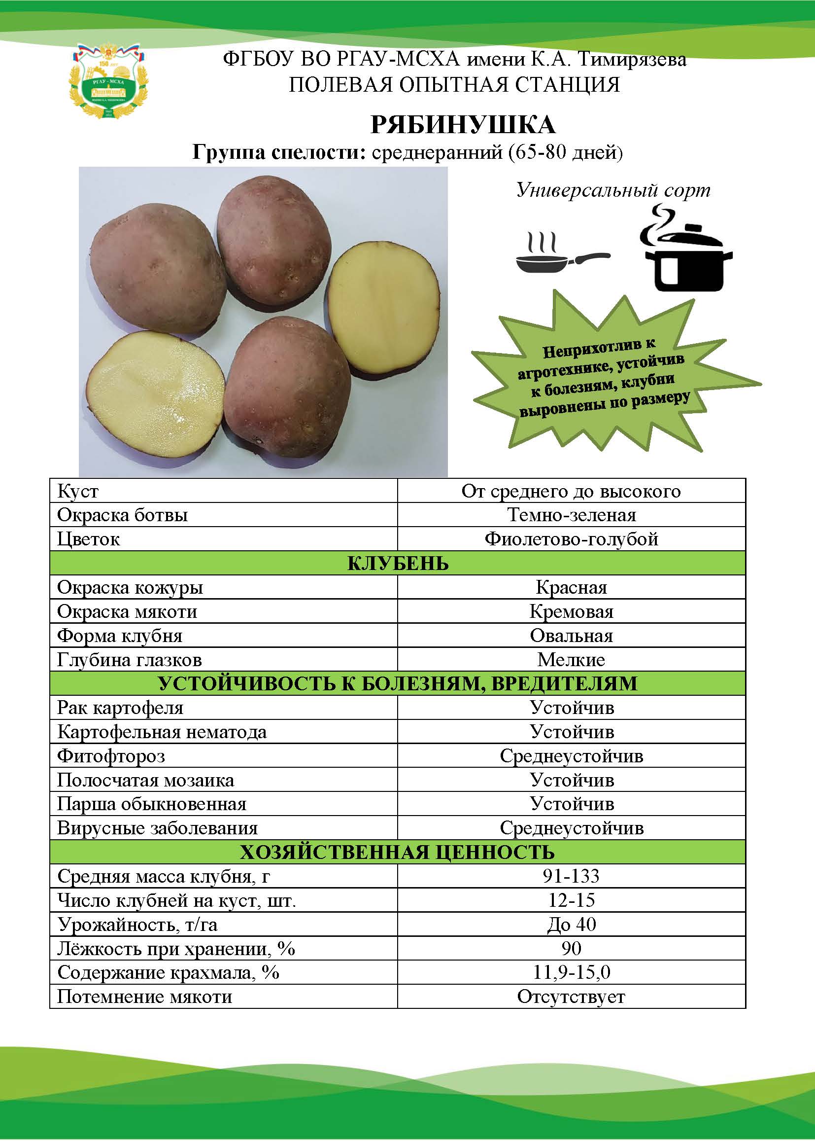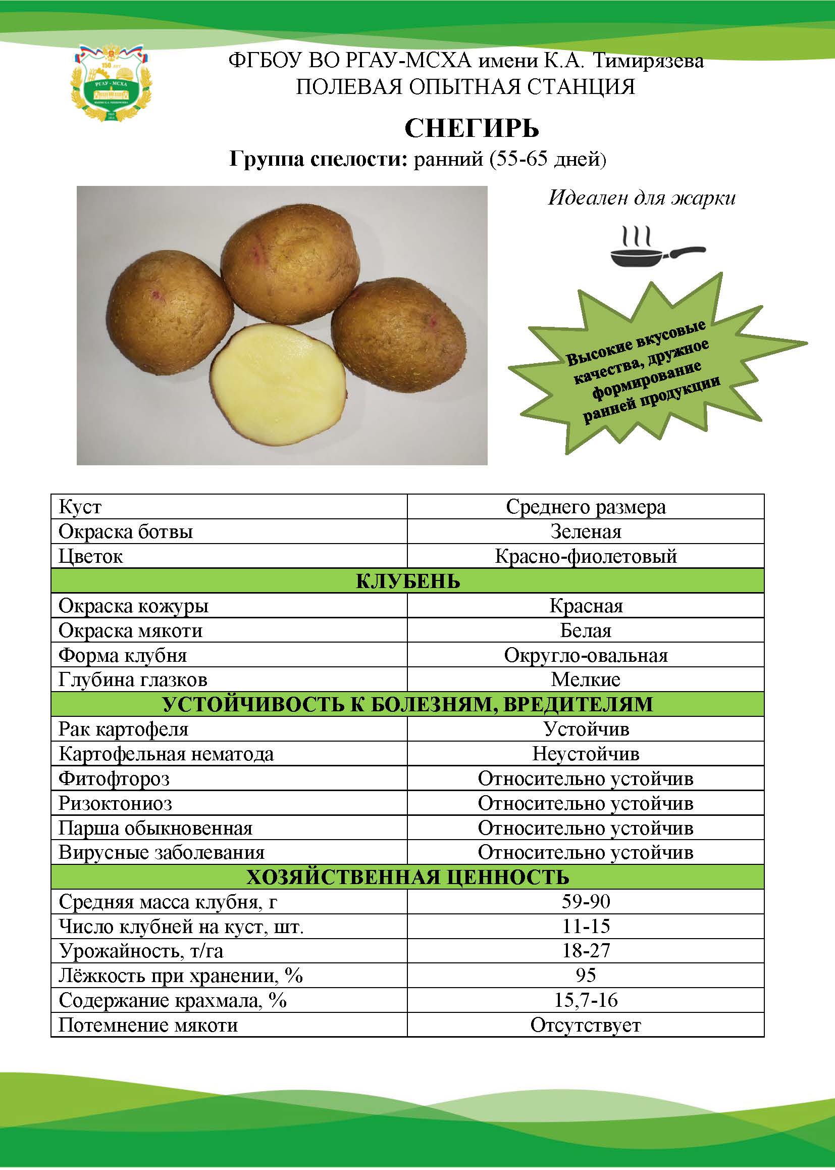 Продовольственный картофель обладает хорошими вкусовыми качествами, содержит крахмал не ниже 14%. Продукция сертифицирована в независимой лаборатории и имеет декларацию соответствия.