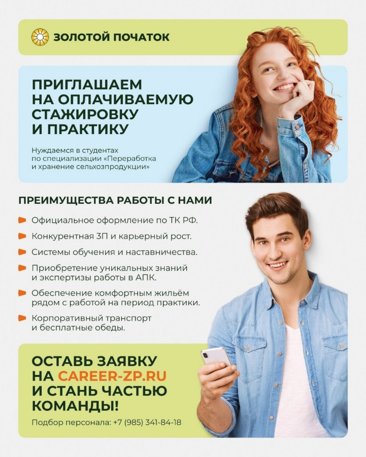 Стажировка у нас – это блестящая возможность познакомиться с компанией «Золотой початок» и получить шанс на дальнейшее сотрудничество.
