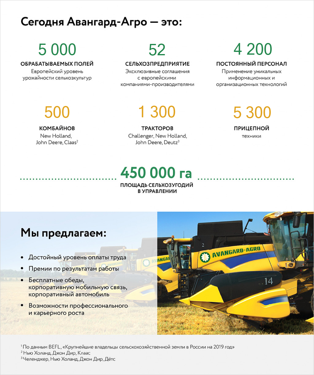 Авангард-Агро — один из крупнейших и наиболее эффективных сельхозпроизводителей в России. Основное направление деятельности Авангард-Агро – выращивание зерновых и технических сельскохозяйственных культур. Компания производит сельскохозяйственную продукцию самого высокого качества как из отечественных, так и из импортных семян передовых селекций, а также из сортов, производимых собственными семенными заводами.