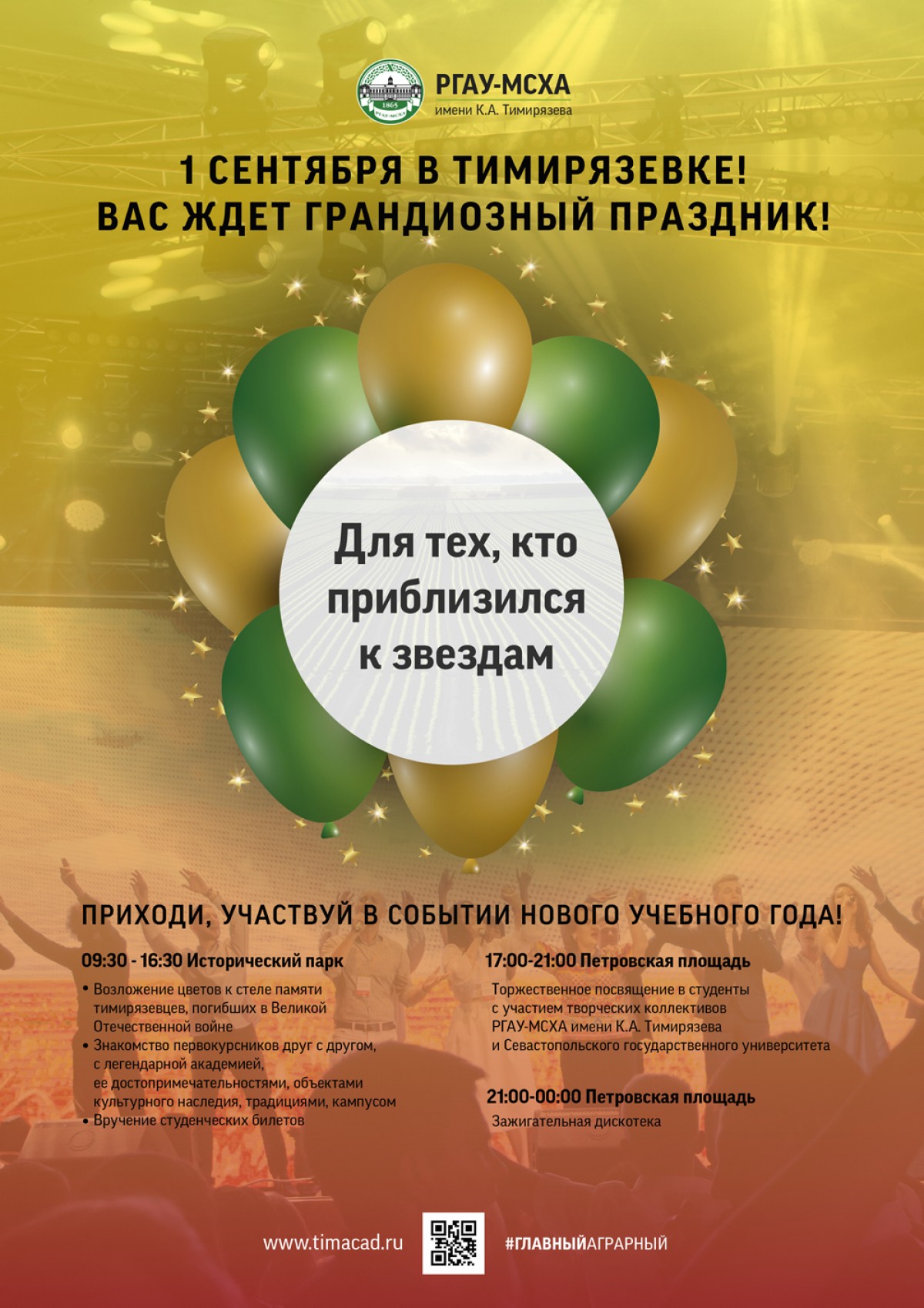 А первокурсники узнают интересные факты о легендарной Тимирязевке, светилах аграрной науки, звездных выпускниках, примут участие в интерактивах. После торжественной клятвы они будут посвящены в студенты главного аграрного вуза страны!