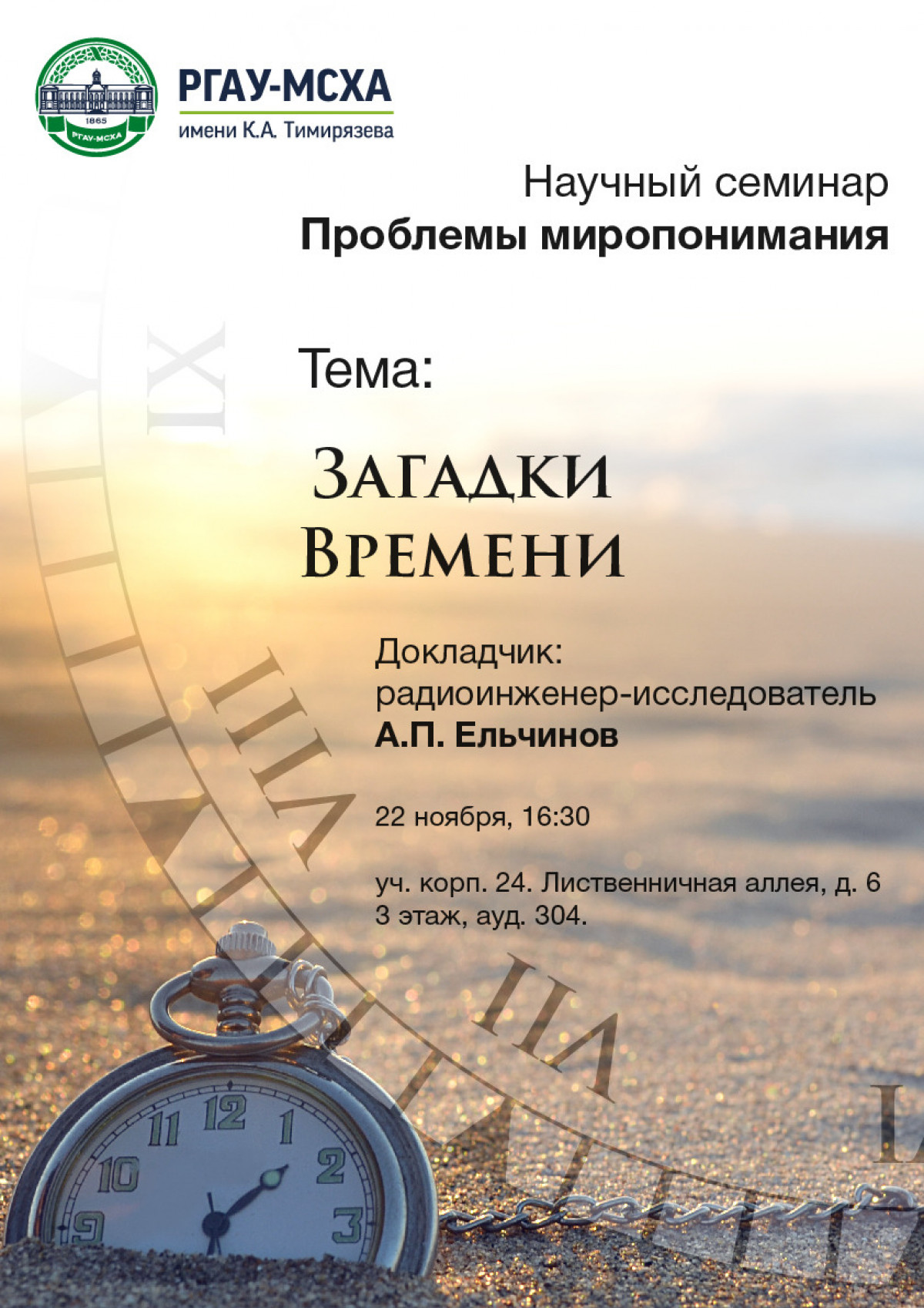 22 ноября / 2018 16:30В четверг перед преподавателями и студентами Тимирязевской академии выступит радиоинженер-исследователь А.П. Ельчинов. Тема семинара «Загадки времени»
