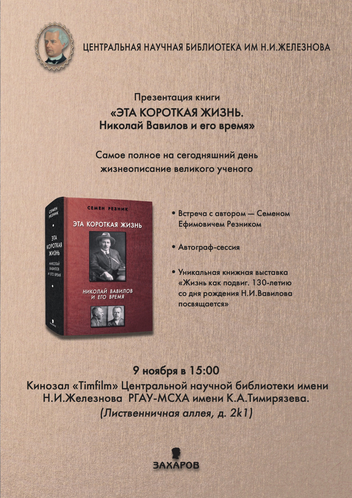 9 ноября в 15:00 в кинозале «TimFilm» Центральной научной библиотеки имени Н.И. Железнова РГАУ-МСХА имени К.А. Тимирязева состоится презентация новой книги Семена Резника “Эта короткая жизнь. Николай Вавилов и его время» издательства «Захаров».