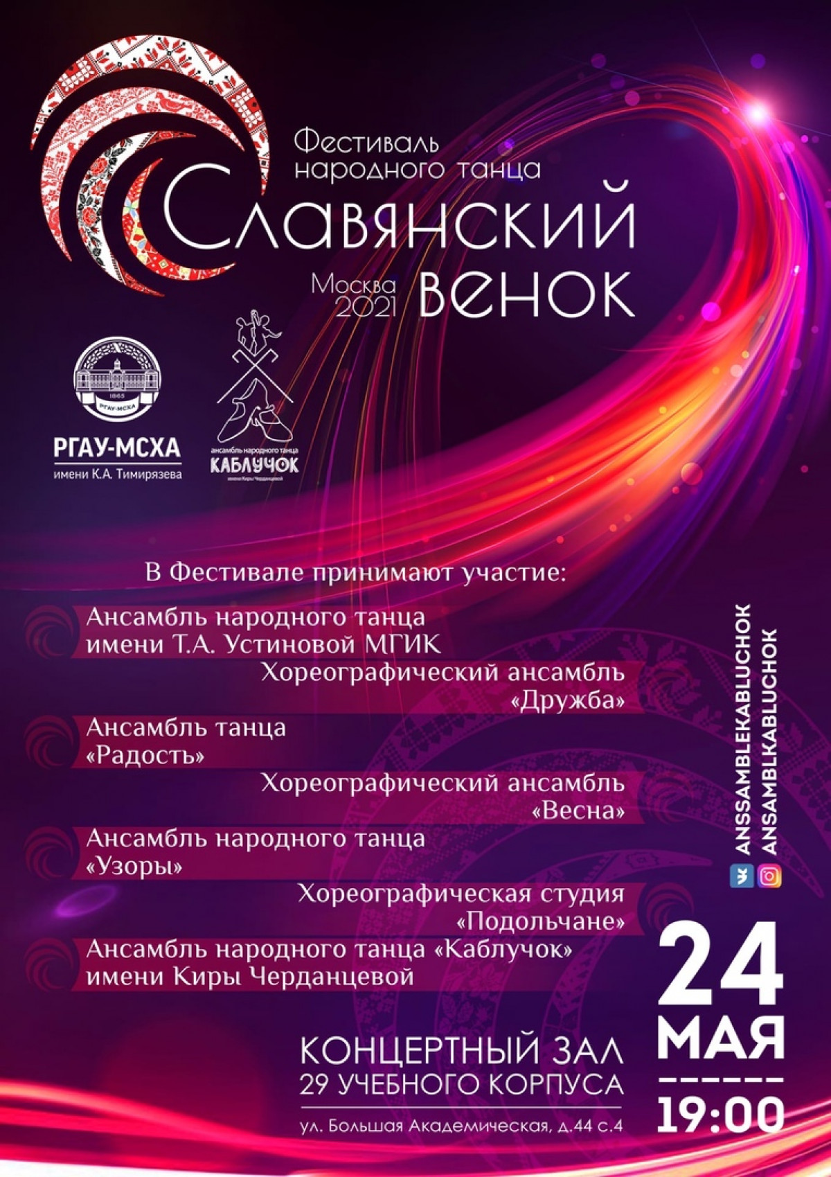 24 мая в 19:00 в Тимирязевской Академии пройдёт большой фестиваль народного танца «Славянский венок».
