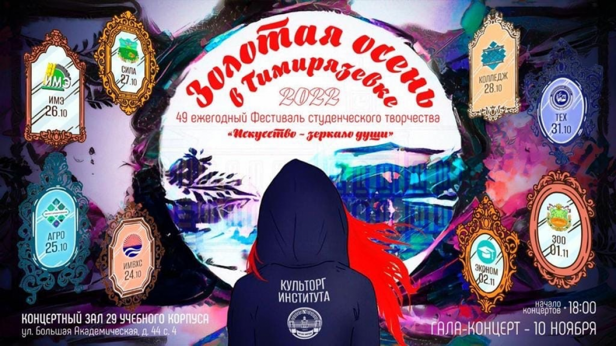 «Осень в Тимирязевке» - это главный фестиваль всех первокурсников, где они могут познакомиться с культурно-массовой деятельностью своего Института и всего университета. Концерты институтов и колледжа проходят с 24 октября по 2 ноября.