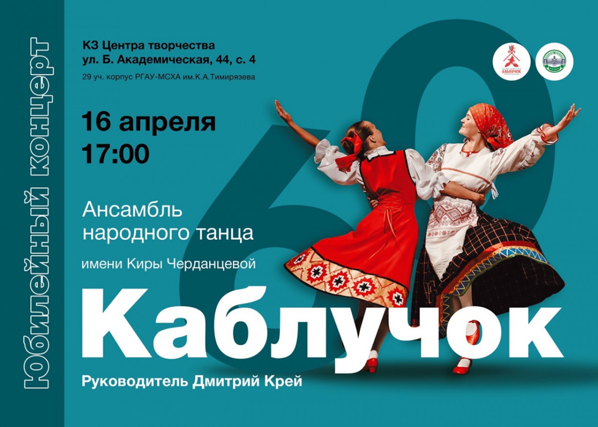 16 апреля ансамблю «Каблучку» имени Киры Черданцевой исполняется 60 лет. В честь знаменательной даты артисты готовят незабываемый вечер народной хореографии: будут сюрпризы, новые постановки, а также танцы,ставшие визитной карточкой коллектива. Художественный руководитель ансамбля - Дмитрий Крей.