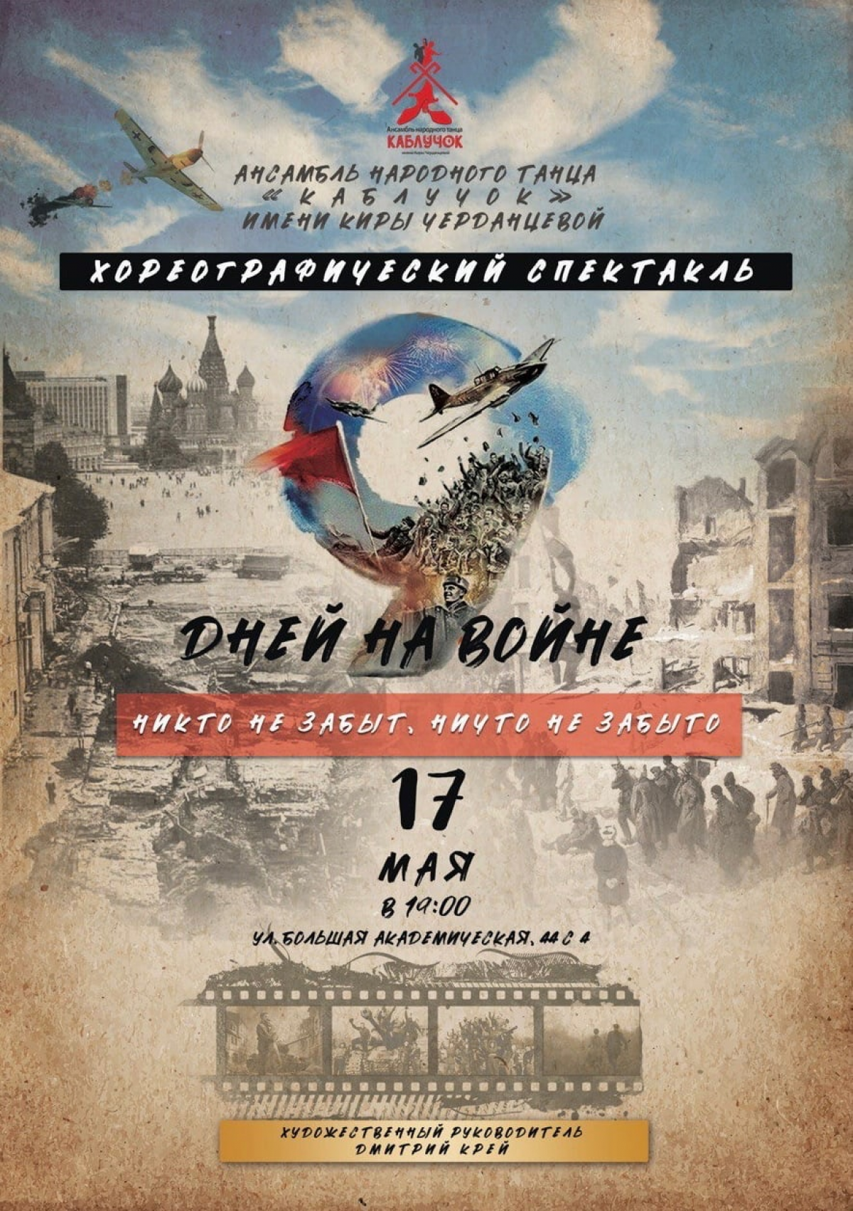 Ансамбль народного танца "Каблучок" приглашает на хореографический спектакль "Девять дней на войне". Он состоится 17 мая в 19:00.