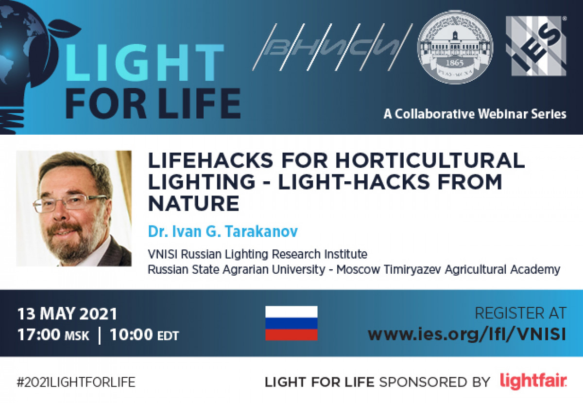 В рамках Всемирного вебинара, организуемого Светотехническим обществом Северной Америки (Illuminating Engineering Society), с онлайн-лекцией Lifehacks for horticultural lighting – light-hacks from Nature” ("Лайфхаки для светокультуры растений - маленькие хитрости от Природы") выступит заведующий кафедрой физиологии растений РГАУ-МСХА имени К.А. Тимирязева, профессор Иван Германович Тараканов.