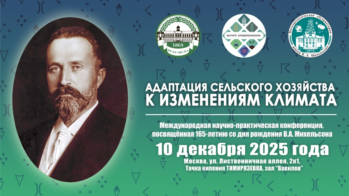 Приглашаем Вас принять участие в Международной научно-практической конференции, посвящённой 165-летию со дня рождения В.А. Михельсона «Адаптация сельского хозяйства к изменениям климата». Мероприятие пройдет 10 декабря 2025 года на базе Российского государственного аграрного университета — МСХА имени К.А. Тимирязева.