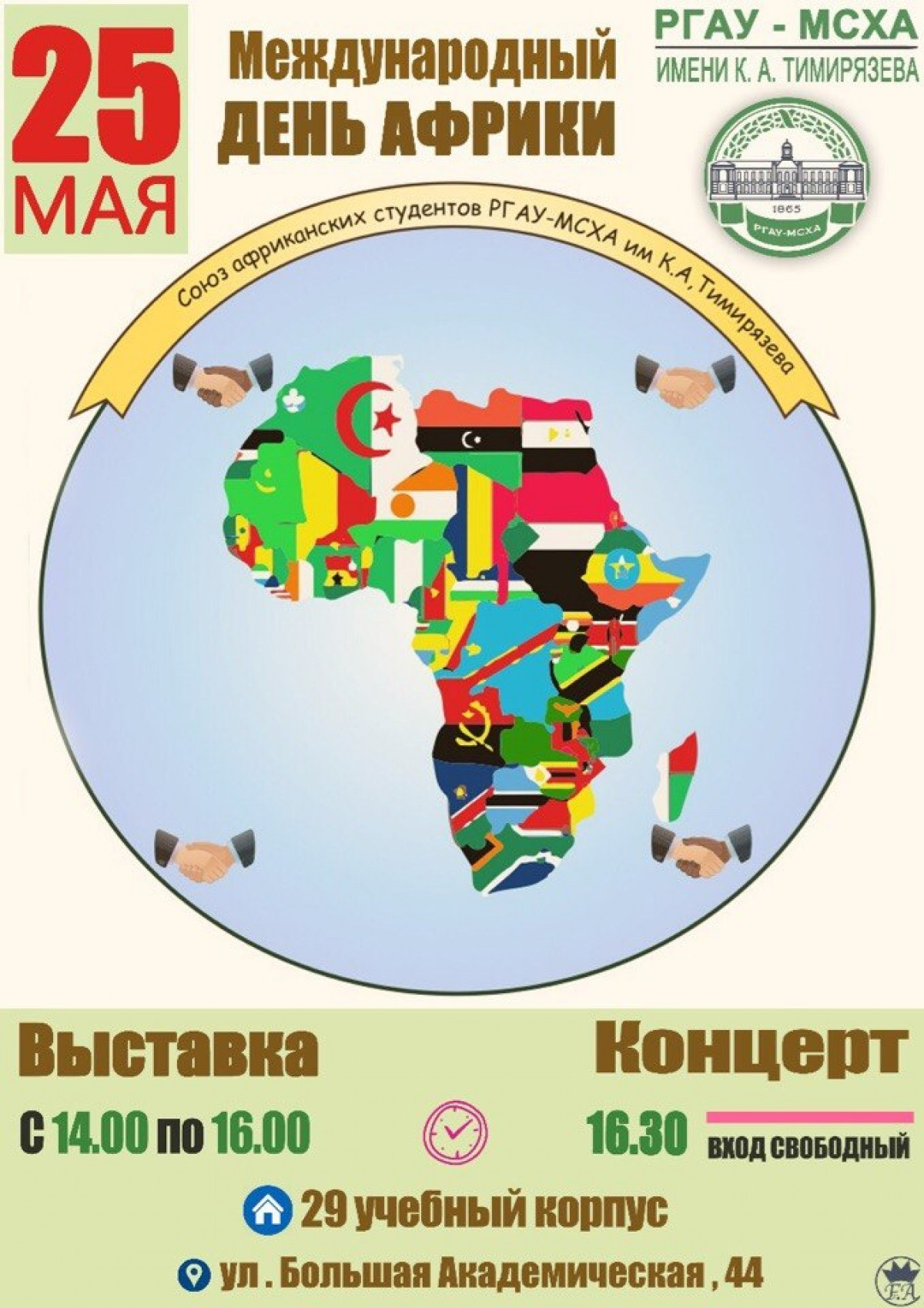 Союз африканских студентов РГАУ-МСХА имени К.А. Тимирязева приглашает всех желающих отпраздновать день Африки и узнать о жизни, культуре, национальных обычаях и традициях этого удивительного континента!