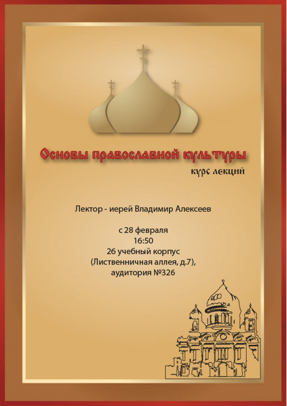 Курс лекций по основам православной культуры. Лектор - иерей Владимир Алексеев Место проведения: 26 учебный корпус (Лиственничная аллея, д.7), аудитория №326. Время начала лекций: 16:50