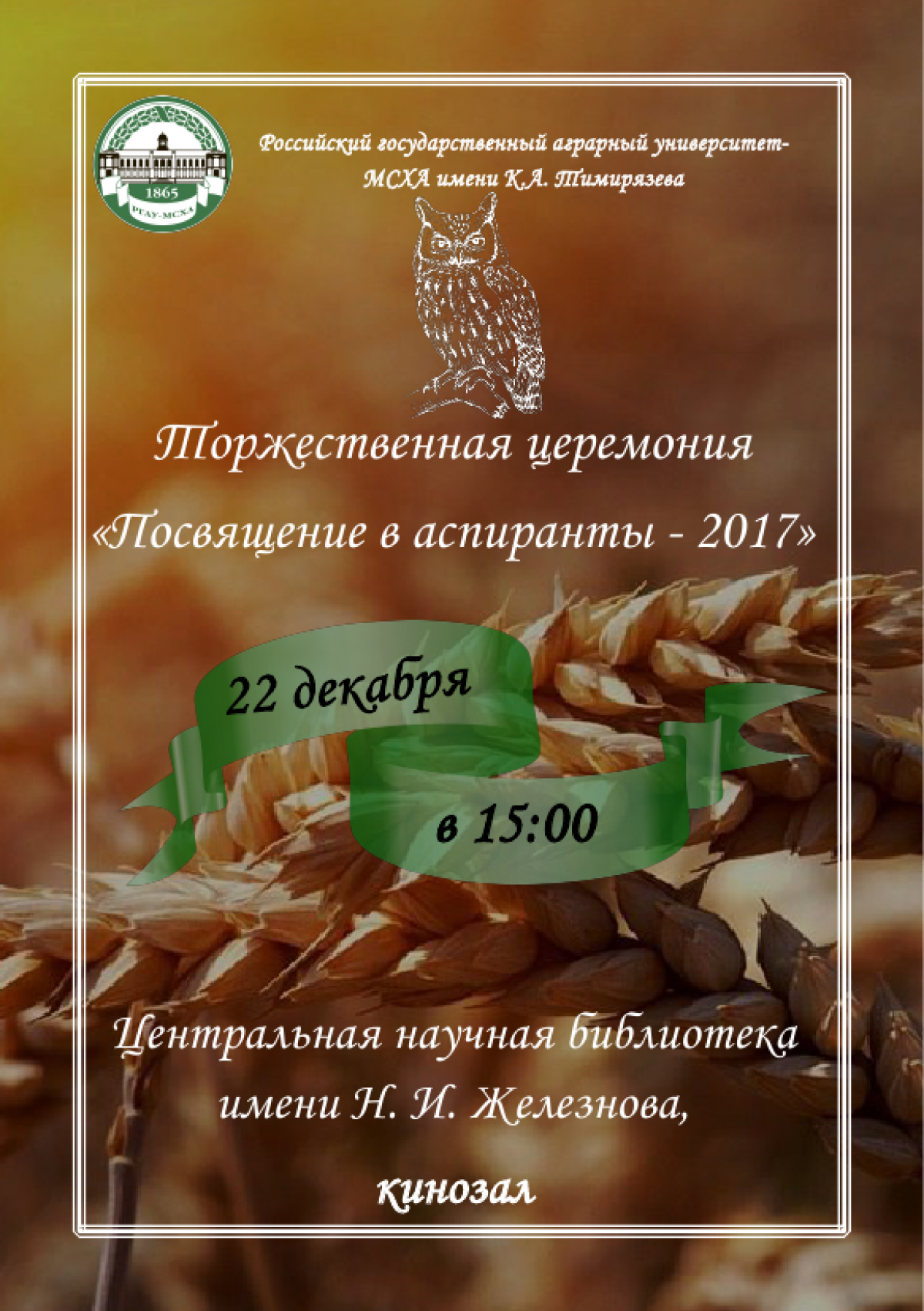 22 декабря 2017 года в 15:00 в Центральной научной библиотеке имени Н.И. Железнова, кинозал состоится ежегодное торжественное мероприятие "Посвящение в аспиранты"