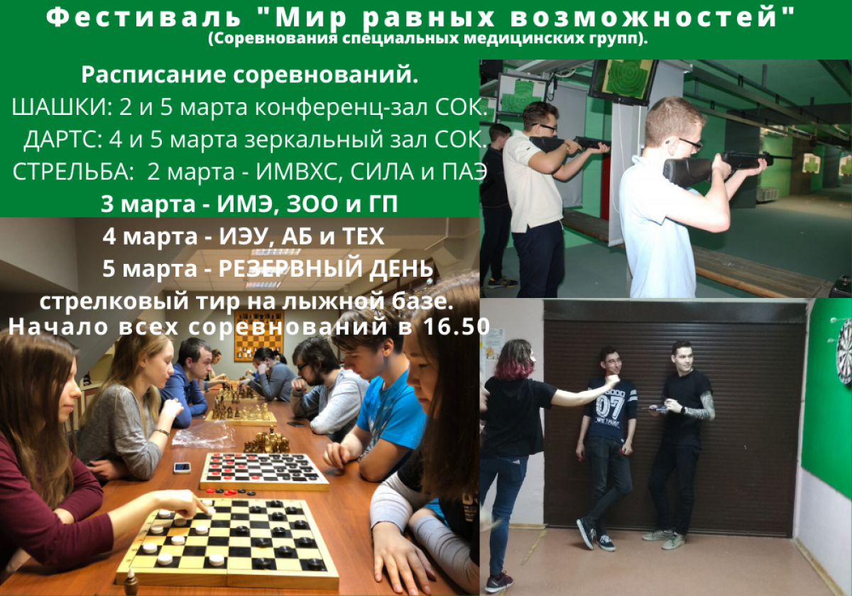 Со 2 по 5 марта на базе спортивно-оздоровительного комплекса и стрелкового тира на лыжной базе проходят соревнования среди студентов специальных медицинских групп «Мир равных возможностей».