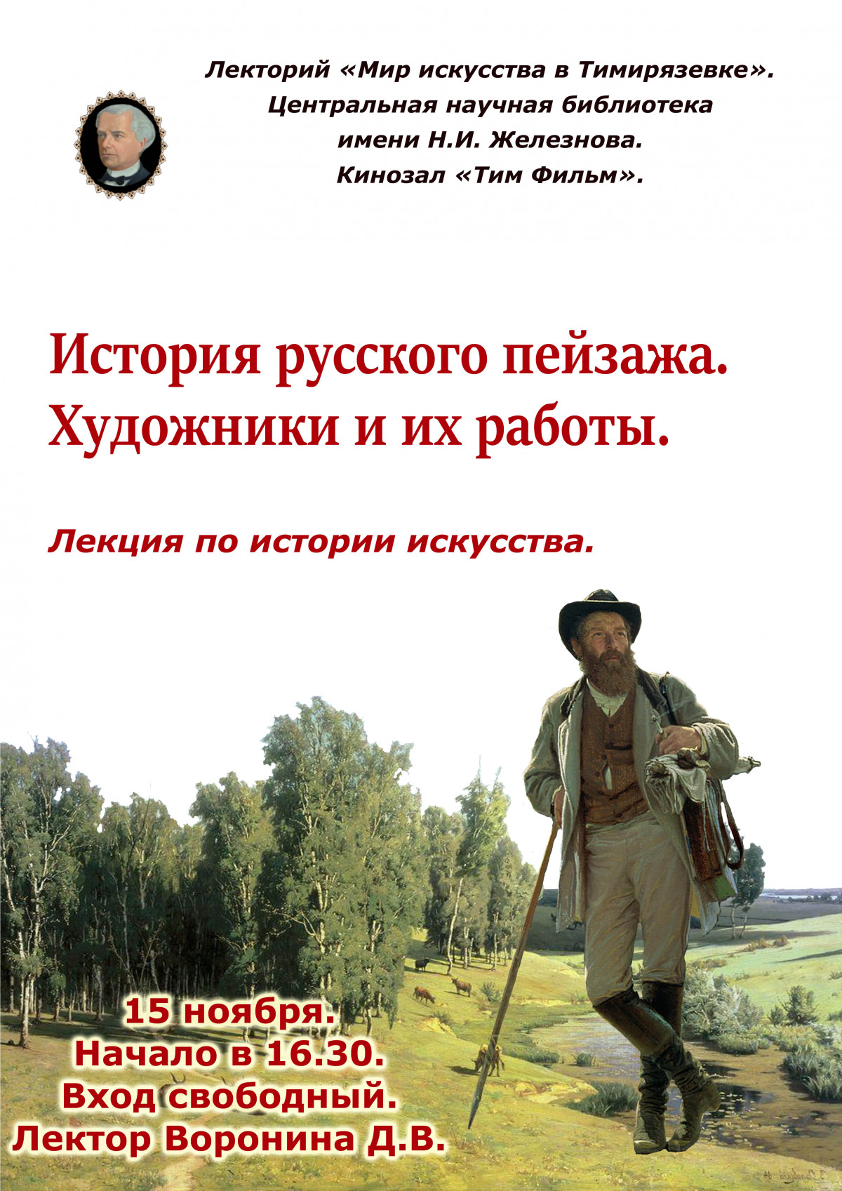 15 ноября в 16:30 в кинозале ТимФильм Центральной научной библиотеки имени Н.И. Железнова состоится лекция искусствоведа Дарьи Ворониной «История русского пейзажа».