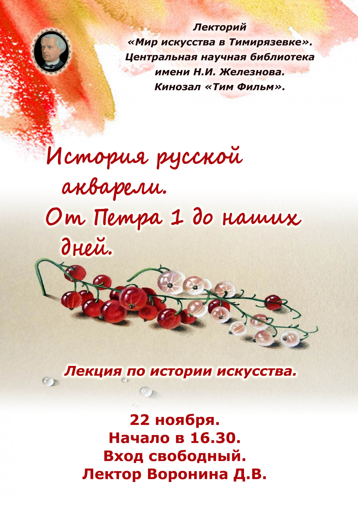 22 ноября / 2017 16:30Она расскажет о зарождении акварели в России, безымянных мастерах петровского времени, основателе школы русского акварельного портрета П.Ф. Соколове. Любители искусства также узнают о братьях-художниках из династии Брюлловых: Карле и Александре, библейских акварелях А. Иванова, мастерах интерьерного жанра Э. Гау и Л. Премацци, неподражаемом художнике ботанической акварели Ф. Толстом. В рамках лектория можно будет познакомиться с творчеством советских мастеров А. Самохвалова и А. Кокорина, а также современных авторов.