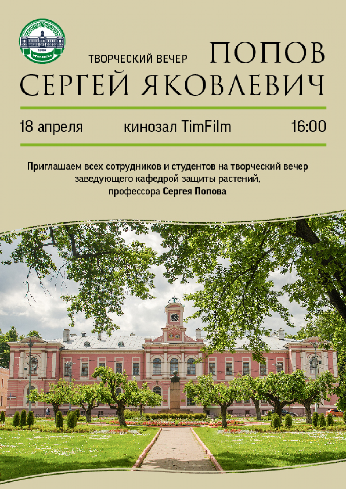 18 апреля в 16:00 в кинозале «ТимФильм» Центральной научной библиотеки имени Н. И. Железнова состоится творческий вечер заведующего кафедрой защиты растений, профессора Сергея Попова.