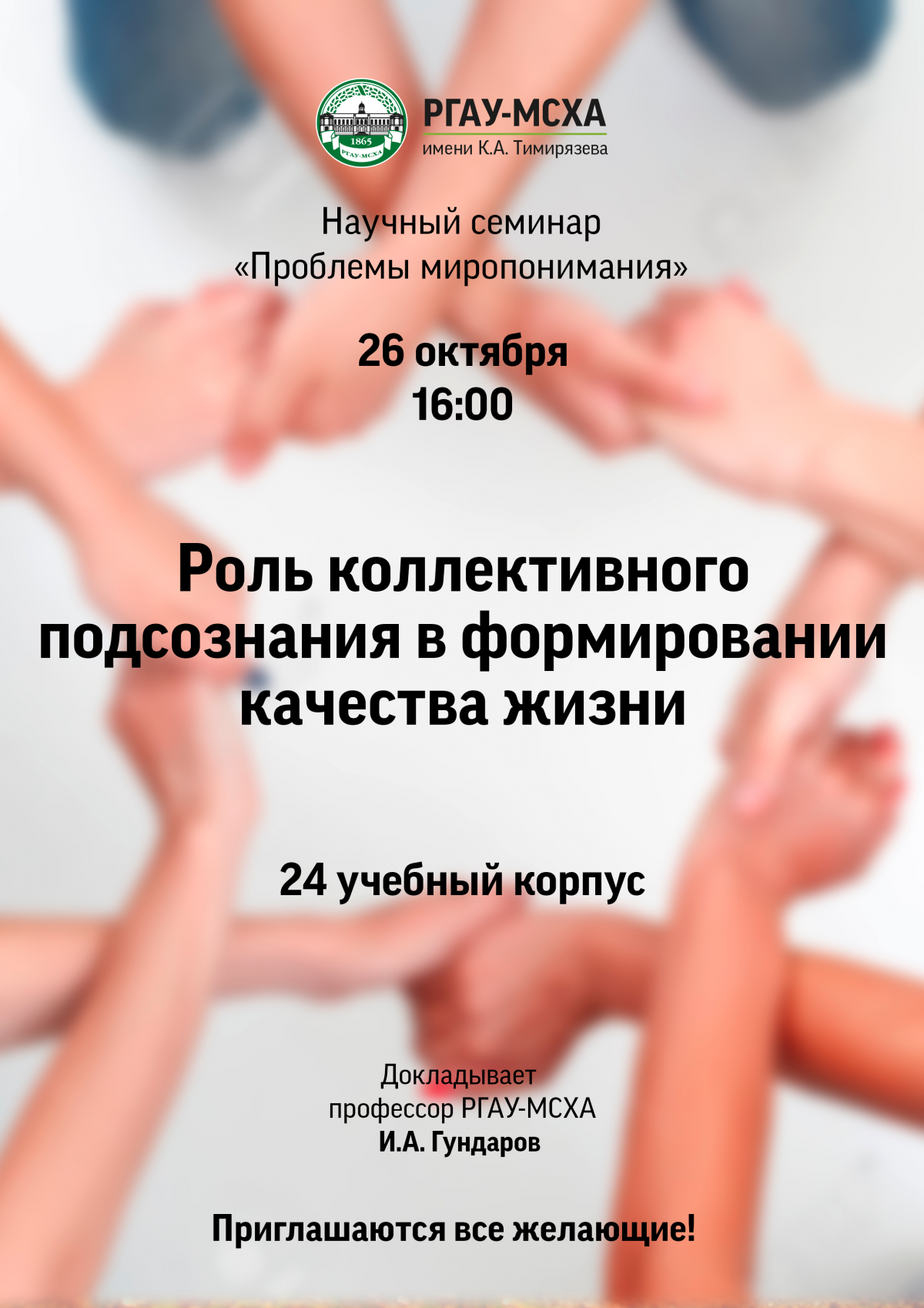 Научный семинар «Проблемы миропонимания» состоится 26 октября в 16:00 на Лиственничной аллее, 6 (24 учебный корпус, 3 этаж, 304 аудитория). Инициатор и организатор мероприятия — Совет ветеранов РГАУ-МСХА имени К.А. Тимирязева под председательством почетного работника ВПО РФ, профессора Ю.И. Агирбова.
