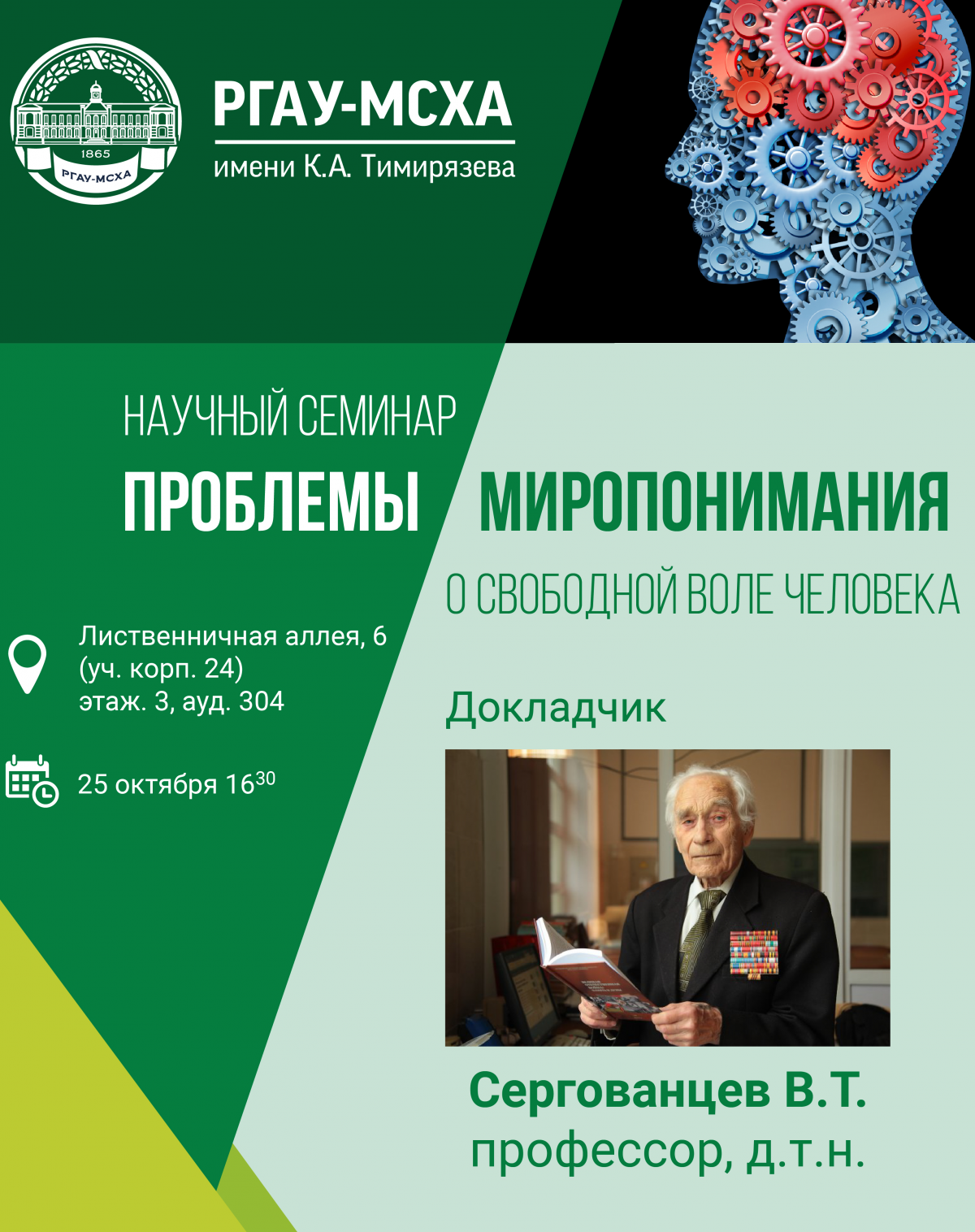 Научный семинар «Проблемы миропонимания» состоится 25 октября в 16.30 в учебном корпусе 24 (3 этаж, 304 аудитория) на Лиственничной аллее, 6. Тема семинара «О свободной воле человека». Докладчик – профессор, доктор технических наук Владимир Трофимович Сергованцев.