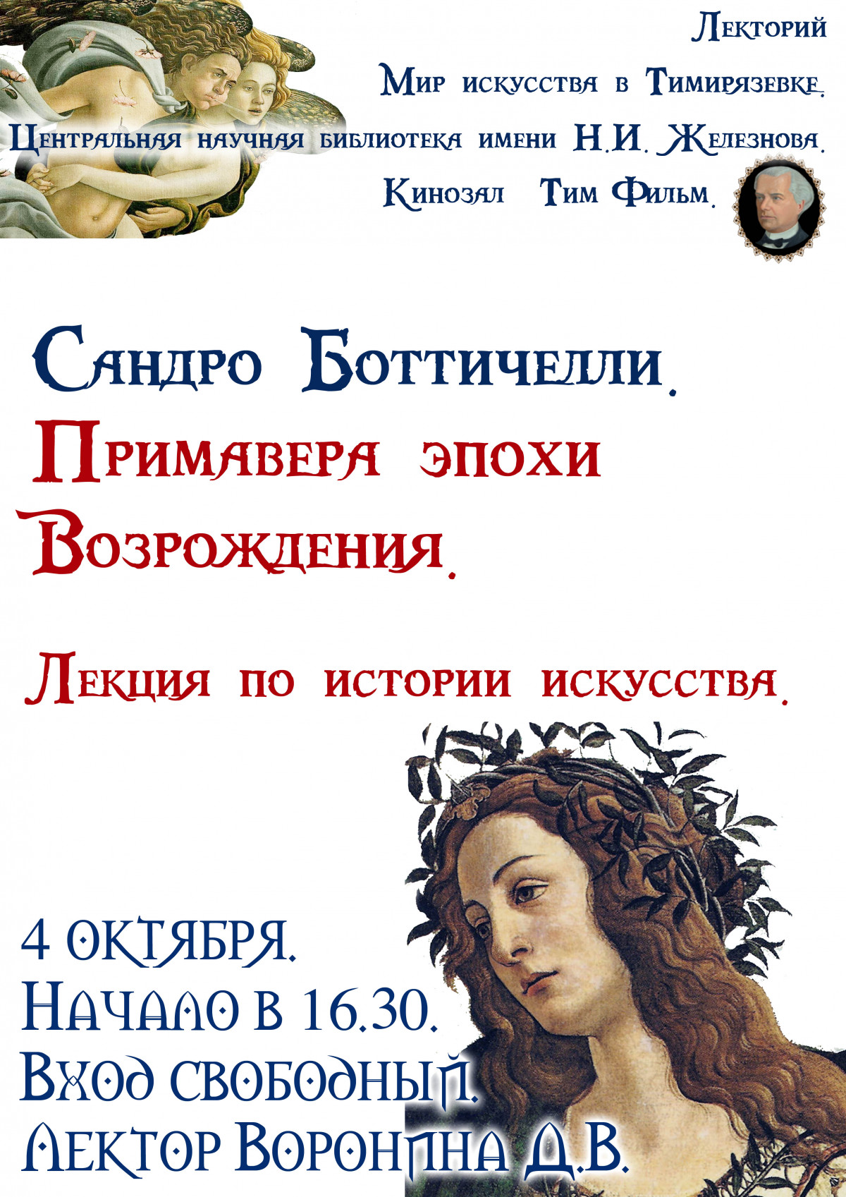 Искусствовед Дарья Воронина прочитает лекцию по истории искусства, посвященную творчеству великого живописца Сандро Боттичелли.