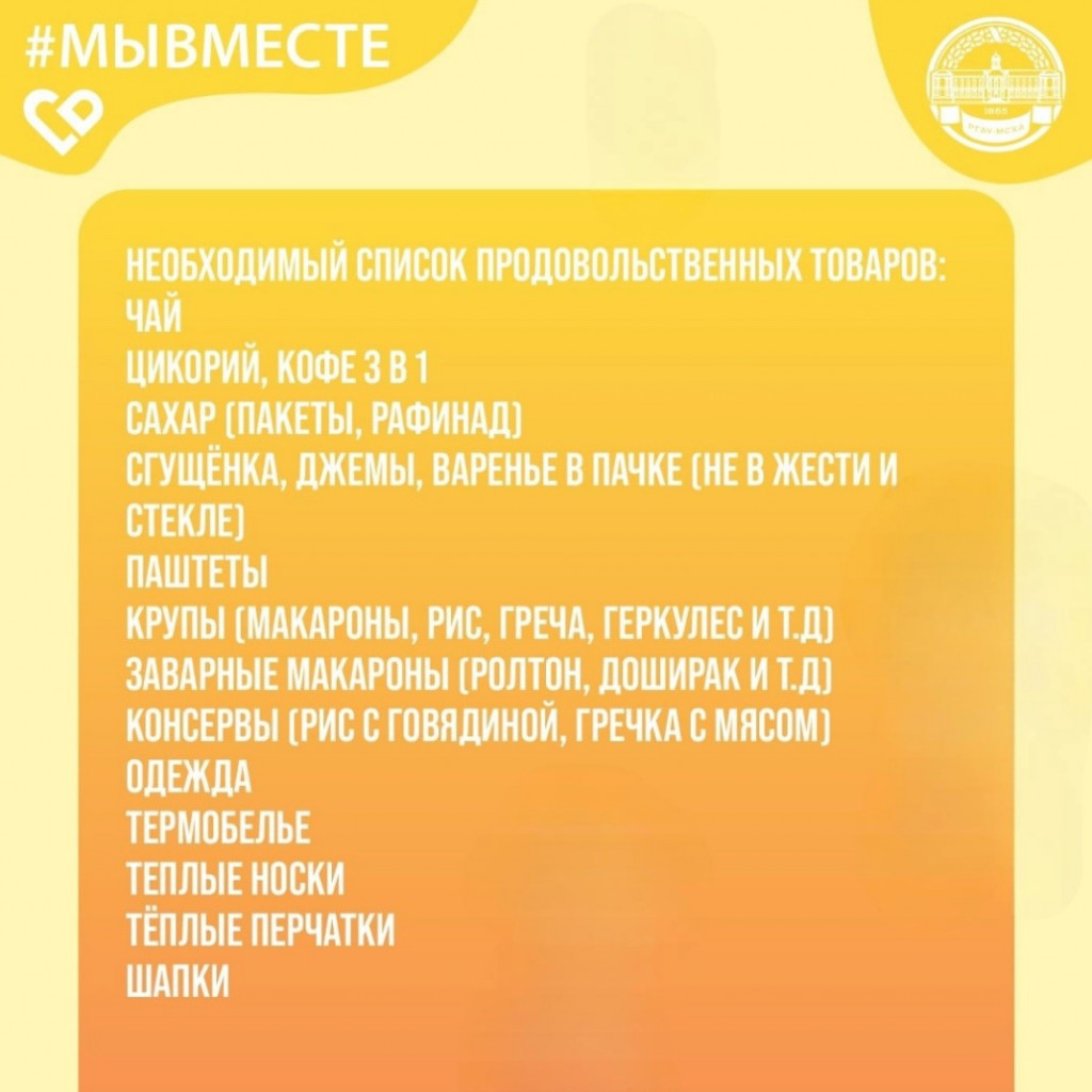 В Тимирязевской академии продолжается сбор помощи и поддержки для наших военнослужащих. К 23 февраля мы присоединяемся к городской акции по сбору подарков для бойцов и приглашаем студентов, преподавателей и сотрудников принять участие.