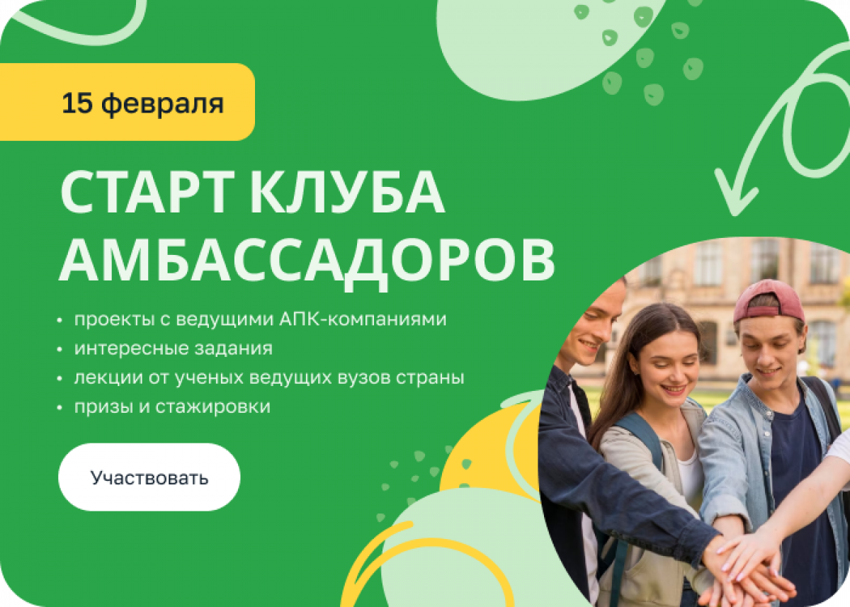 15 февраля / 2023 17:00Вступить в клуб может любой студент аграрного или технологического вуза России. Для регистрации необходимо перейти на страницу клуба - https://svoevagro.ru/students/ambassadors