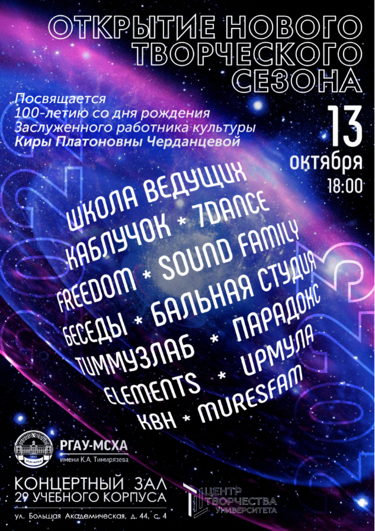 13 октября в 18:00 состоится большой концерт, посвященный старту нового сезона в Центре творчества РГАУ-МСХА имени К.А. Тимирязева.
