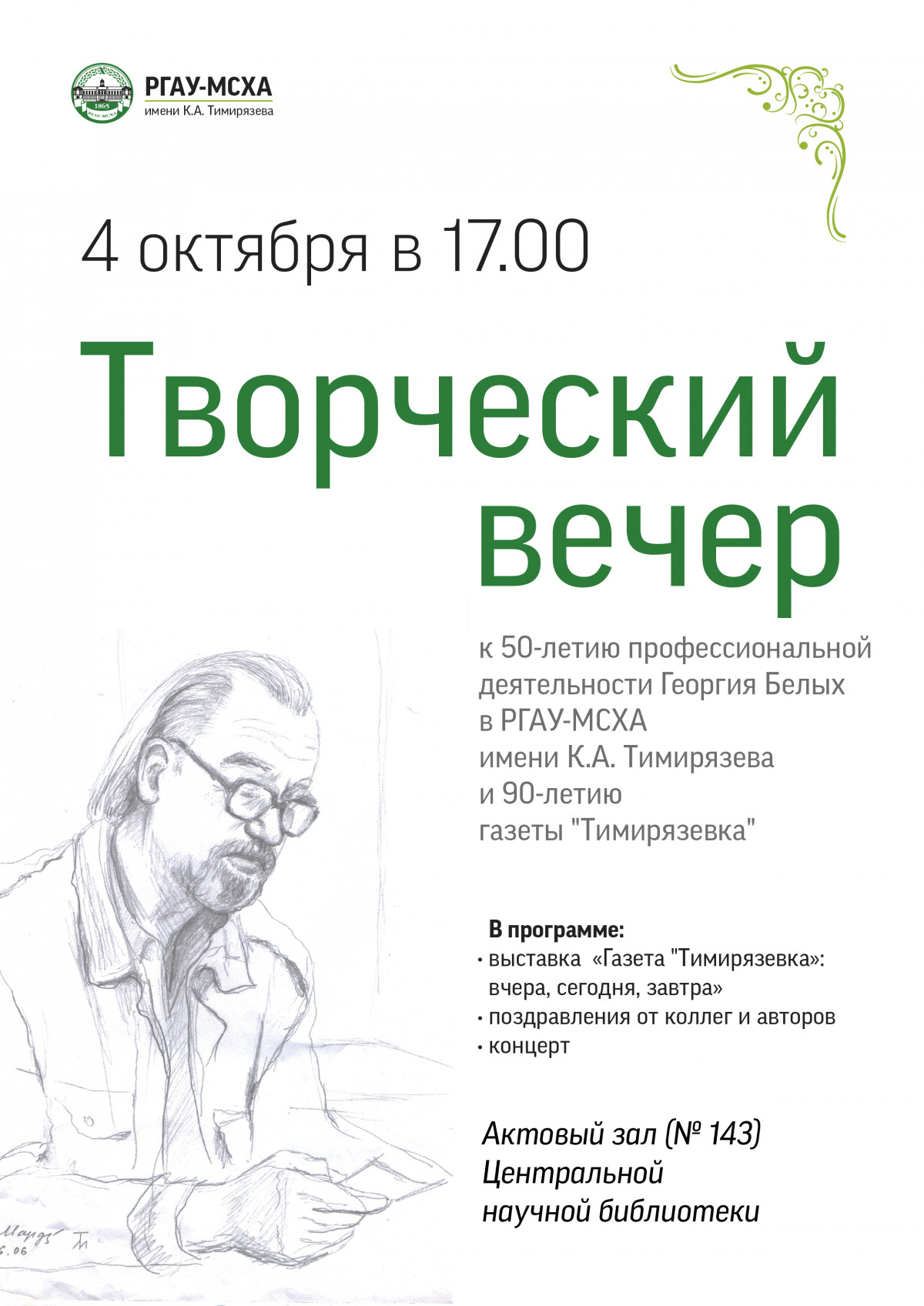 4 октября в 17.00 в Центральной научной библиотеке состоится творческий вечер, посвященный 50-летней профессиональной деятельности Георгия Белых в РГАУ-МСХА имени К.А. Тимирязева и 90-летию газеты "Тимирязевка".