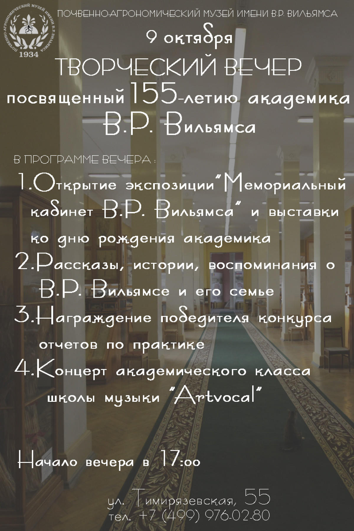 О научной и педагогической деятельности В.Р. Вильямса написано множество работ. 9 октября в Почвенно-агрономическом музее состоится творческий вечер, посвященный не только Вильямсу - известному ученому, но и Вильямсу - талантливому человеку с удивительной биографией. Вы узнаете, например, какое имя было дано Василию Вильямсу при рождении, и кем он собирался стать до поступления в Тимирязевку.