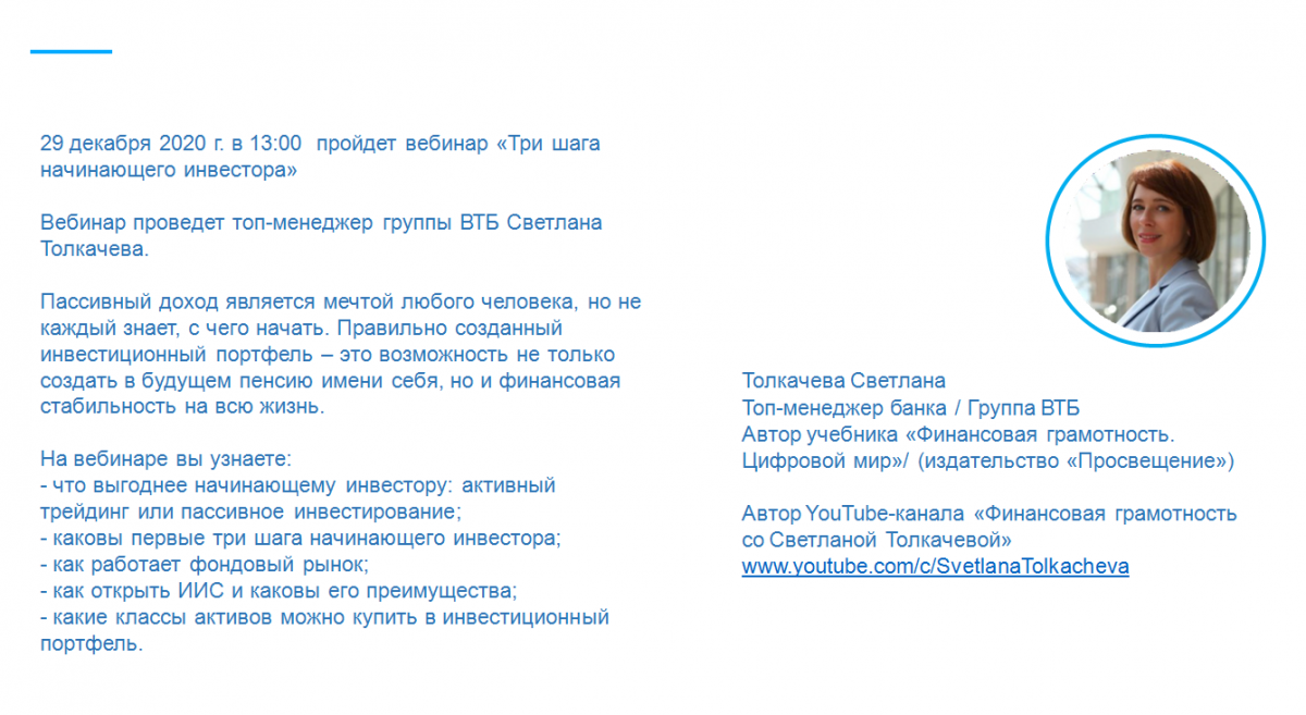 29 декабря состоится четвёртый по счёту вебинар по повышению финансовой грамотности с ведущим специалистом "ВТБ" Светланой Толкачевой.