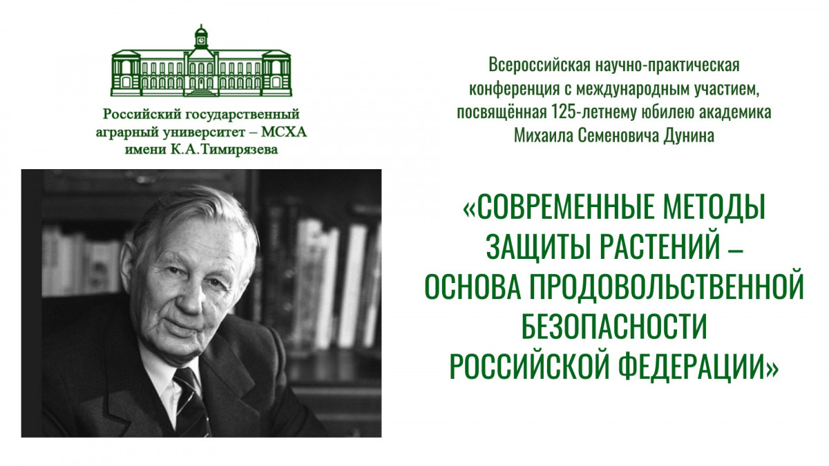 Всероссийская научно-практическая конференция с международным участием, посвящённая 125-летнему юбилею академика Михаила Семеновича Дунина «СОВРЕМЕННЫЕ МЕТОДЫ ЗАЩИТЫ РАСТЕНИЙ – ОСНОВА ПРОДОВОЛЬСТВЕННОЙ БЕЗОПАСНОСТИ РОССИЙСКОЙ ФЕДЕРАЦИИ» Уважаемые коллеги, приглашаем Вас принять участие во Всероссийской научно-практической конференции с международным участием, посвящённой 125-летнему юбилею академика Михаила Семеновича Дунина! Мероприятия пройдут 21-22 мая 2026 года в ФГБОУ ВО «Российский государственный аграрный университет – МСХА имени К.А. Тимирязева» и будут включать доклады на пленарном и секционном заседаниях, школу молодых учёных.