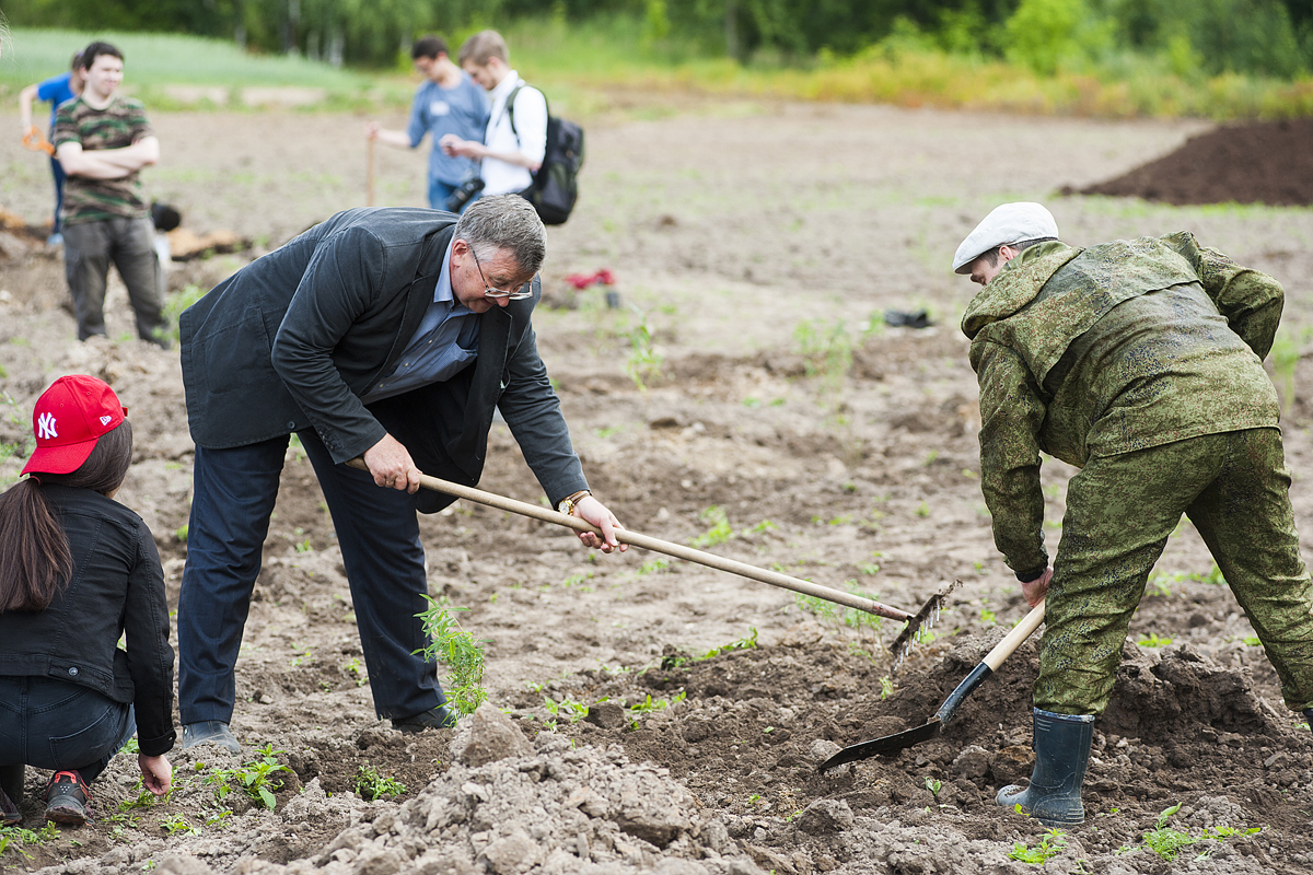 Руководитель Полевой опытной станции Иван Жогин обеспечил специальной техникой – трактором и экскаватором. На поле были проведены работы – дискование и культивация, подготовлены лунки для посадки. Сотрудники плодовой опытной станции предоставили саженцы пурпурной ивы.