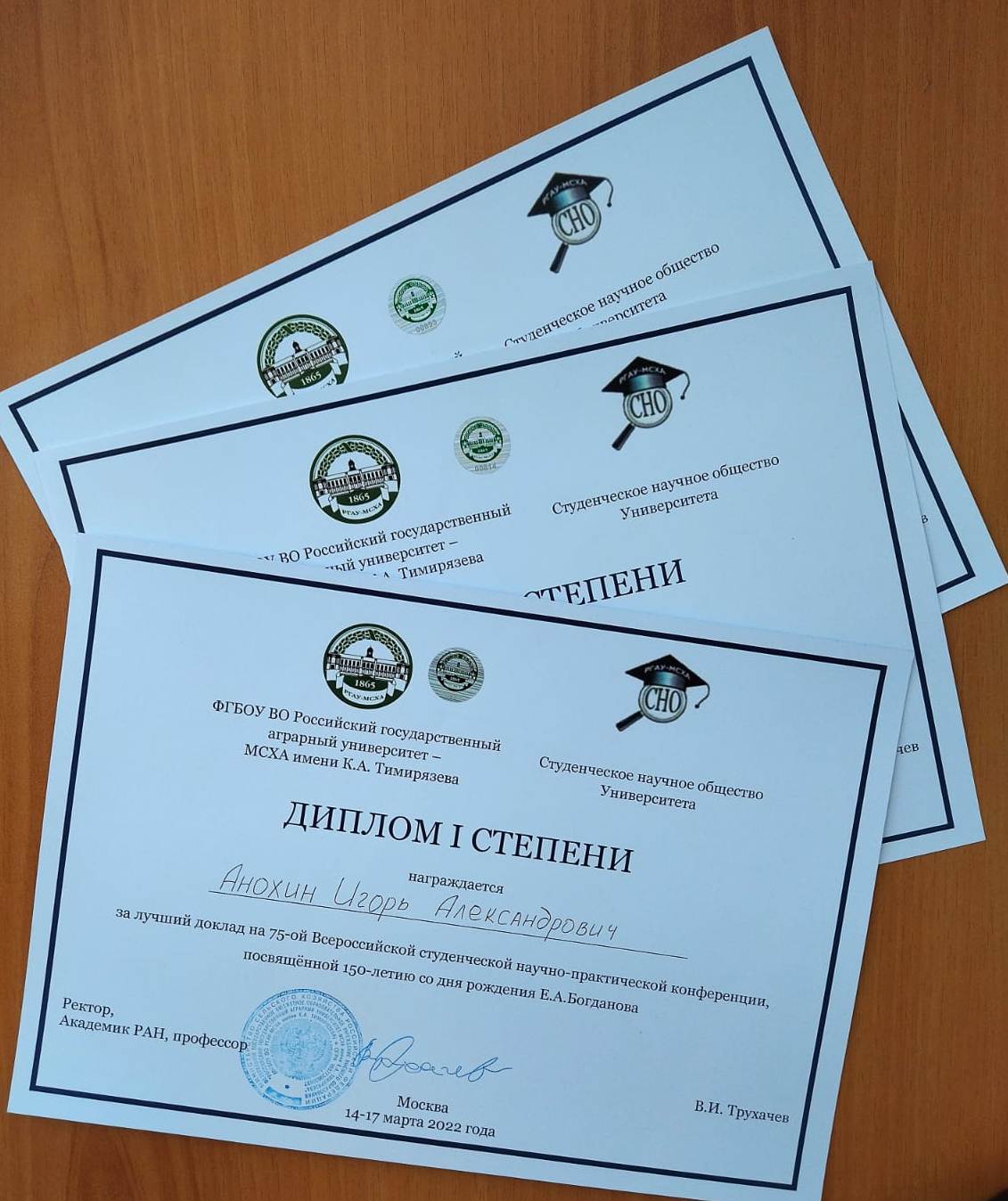 1 место: Анохин Игорь Александрович, студент 4 курса, научный руководитель: к.э.н., доцент Ю.Н. Катков с темой «Формирование системы внешнеэкономической безопасности в организациях АПК»;