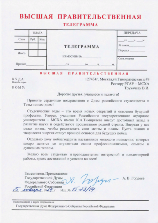 Заместитель Председателя Государственной Думы Российской Федерации Алексей Васильевич Гордеев направил поздравительную телеграмму многотысячному коллективу Тимирязевской академии и лично ректору, Академику РАН, профессору Владимиру Ивановичу Трухачеву по случаю Дня российского студенчества. Законодатель и Академик РАН пожелал студентам и преподавателям интересной и плодотворной работы, ярких достижений и успехов.