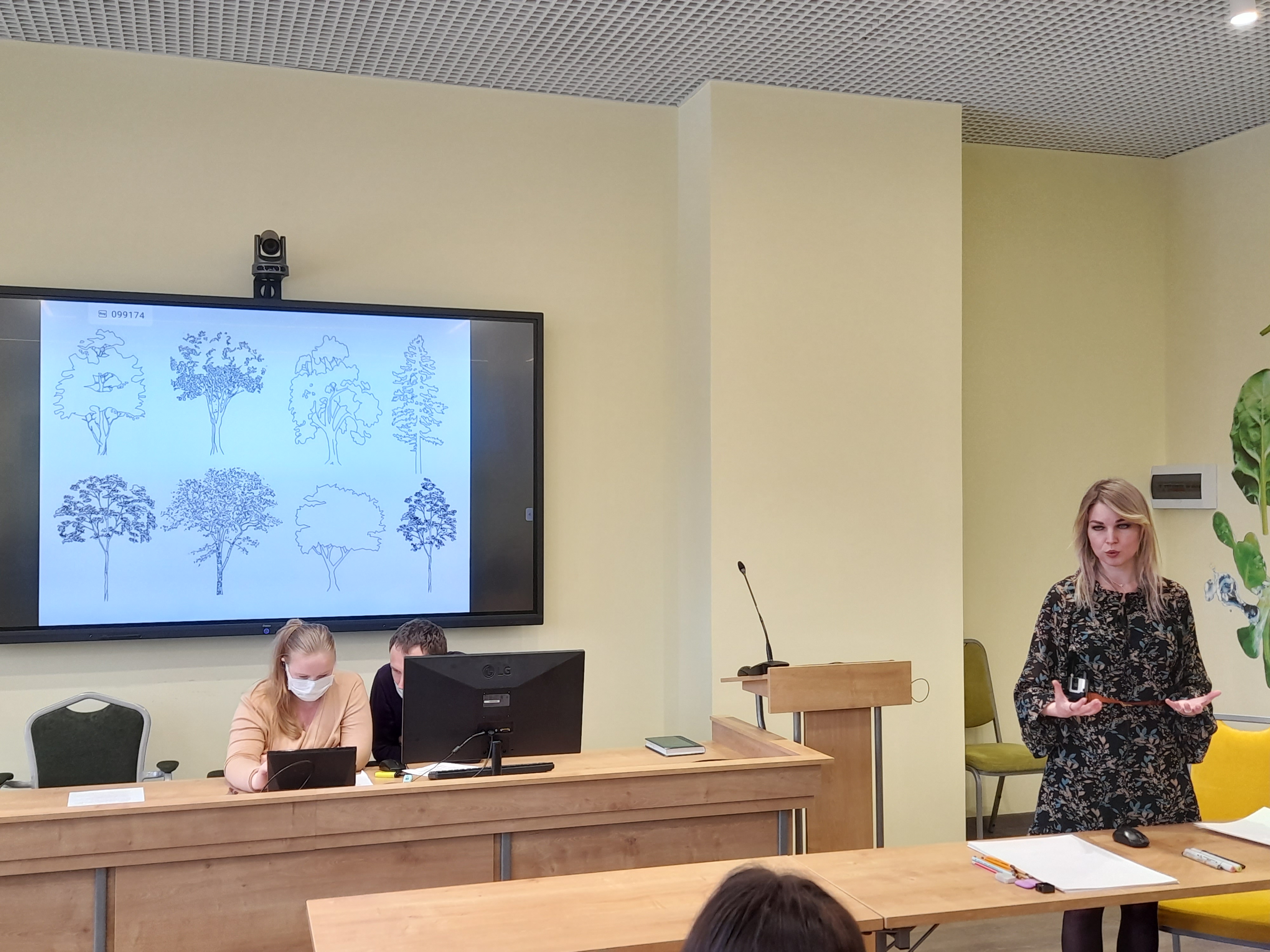 Так, на примере изображения крупной древесной породы дерева, Скабелкина Ольга Александровна, ассистент кафедры ландшафтной архитектуры, продемонстрировала возможности передачи первых впечатлений в быстром темпе и возможность выразить свои мысли и идеи в изображении своей творческой задумки. Она рассказала, что архитекторам и декораторам, выпускникам кафедр «Ландшафтной архитектуры» и «Декоративного садоводства и газоноведения», чаще приходится сталкиваться с ботаническим и архитектурным (городским) скетчингом. Городской скетчинг – это зарисовки цветочных композиций, городских сооружений, зданий, улиц, цветников и малых архитектурных форм, передающих атмосферу декоративного оформления городов и малых садов. Преподаватель рекомендовала для скетчинга лучше использовать мягкие графические материалы: карандаш, цветные мелки, сангина, уголь и т.п.