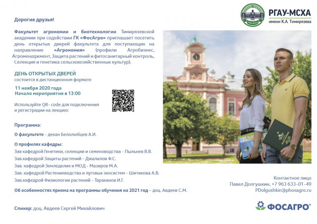 С общей информацией о факультете агрономии и биотехнологии познакомит декан Александр Иванович Белолюбцев. Доцент Сергей Михайлович Авдеев расскажет об особенностях приема на программы обучения РГАУ-МСХА имени К.А. Тимирязева в 2021 году.
