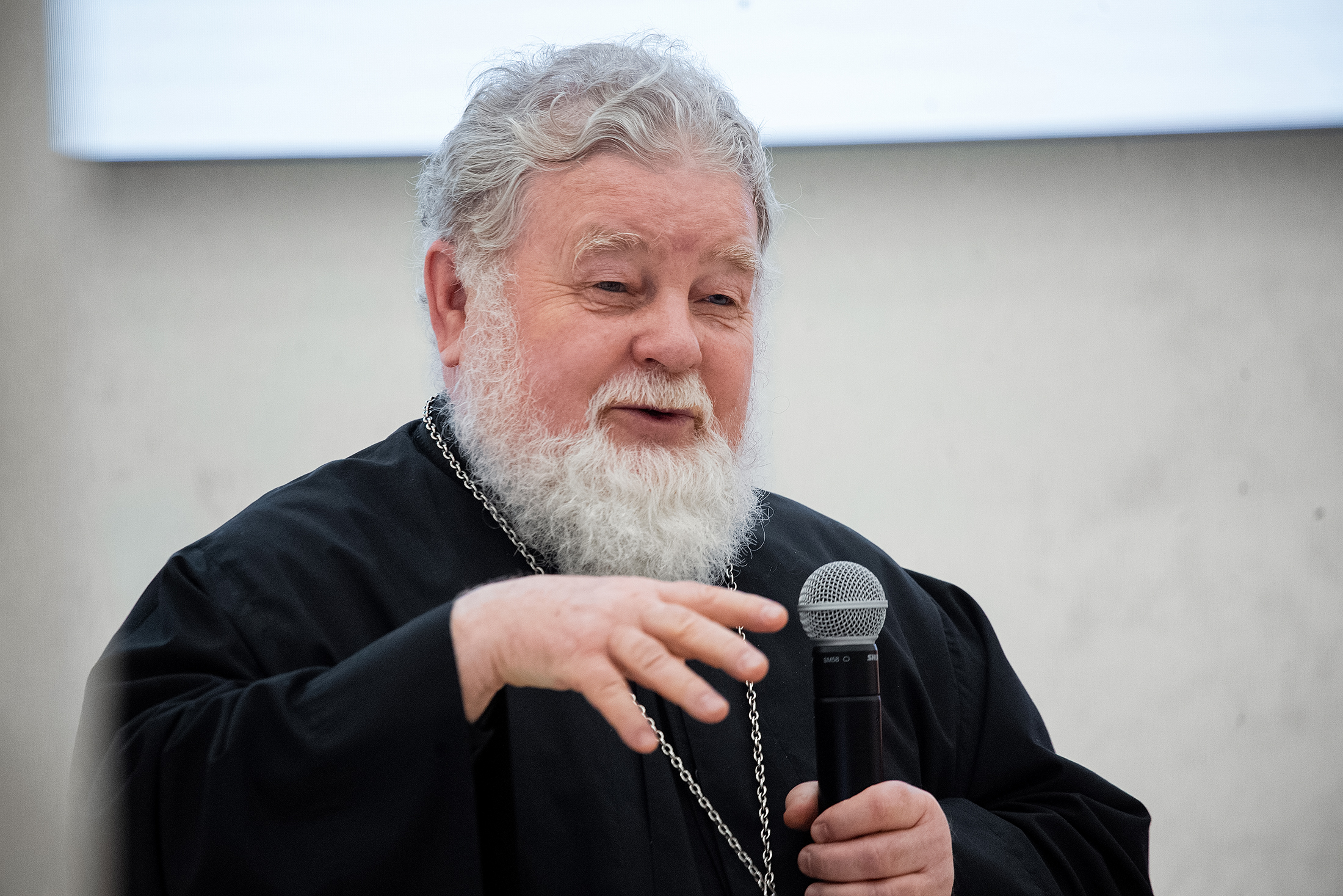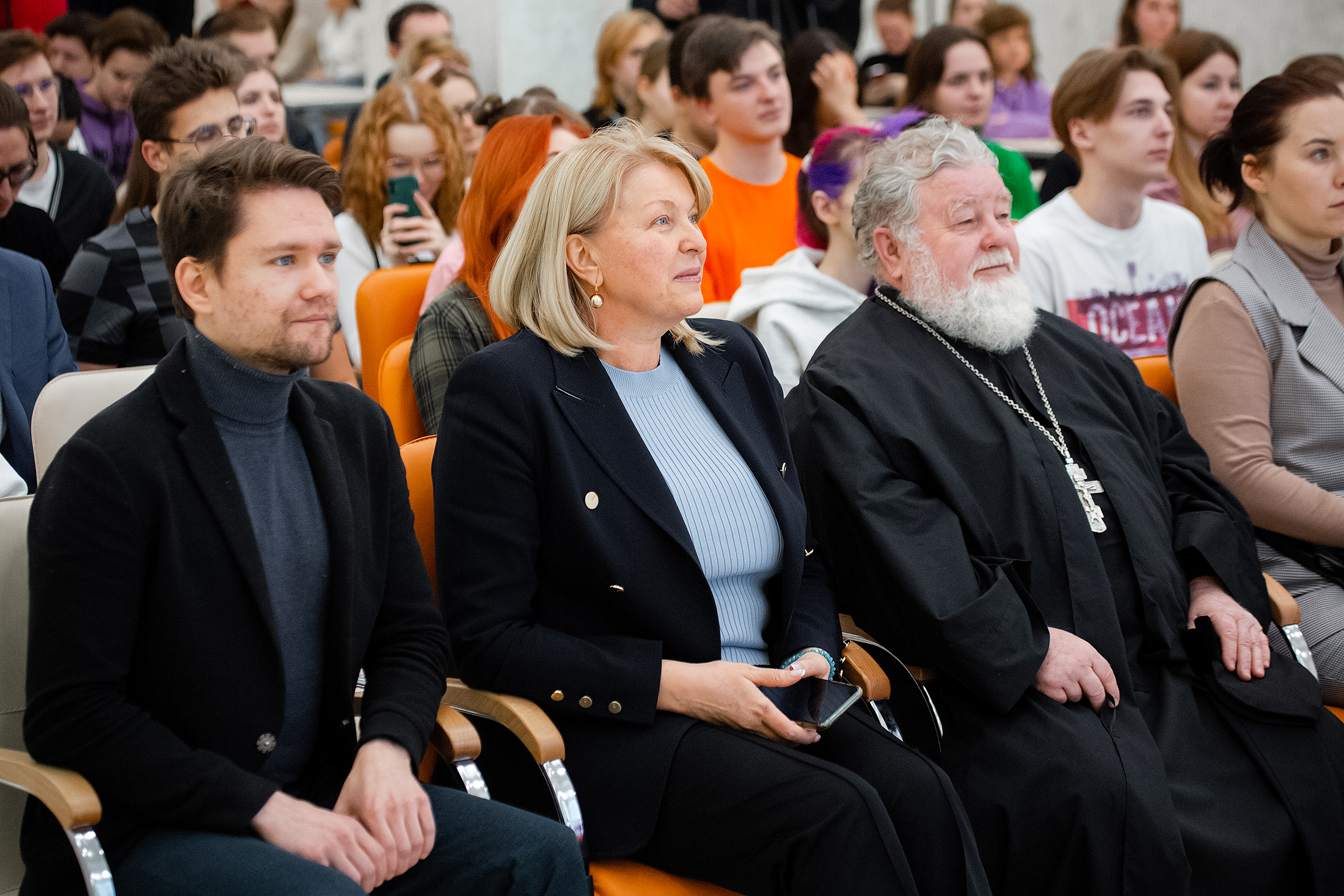 Перед началом встречи с И.И. Охлобыстиным к студентам обратился Настоятель домового храма Тимирязевки отец Владимир. Он поздравил участников собрания с Крещенским сочельником и наступающим праздником Богоявления.