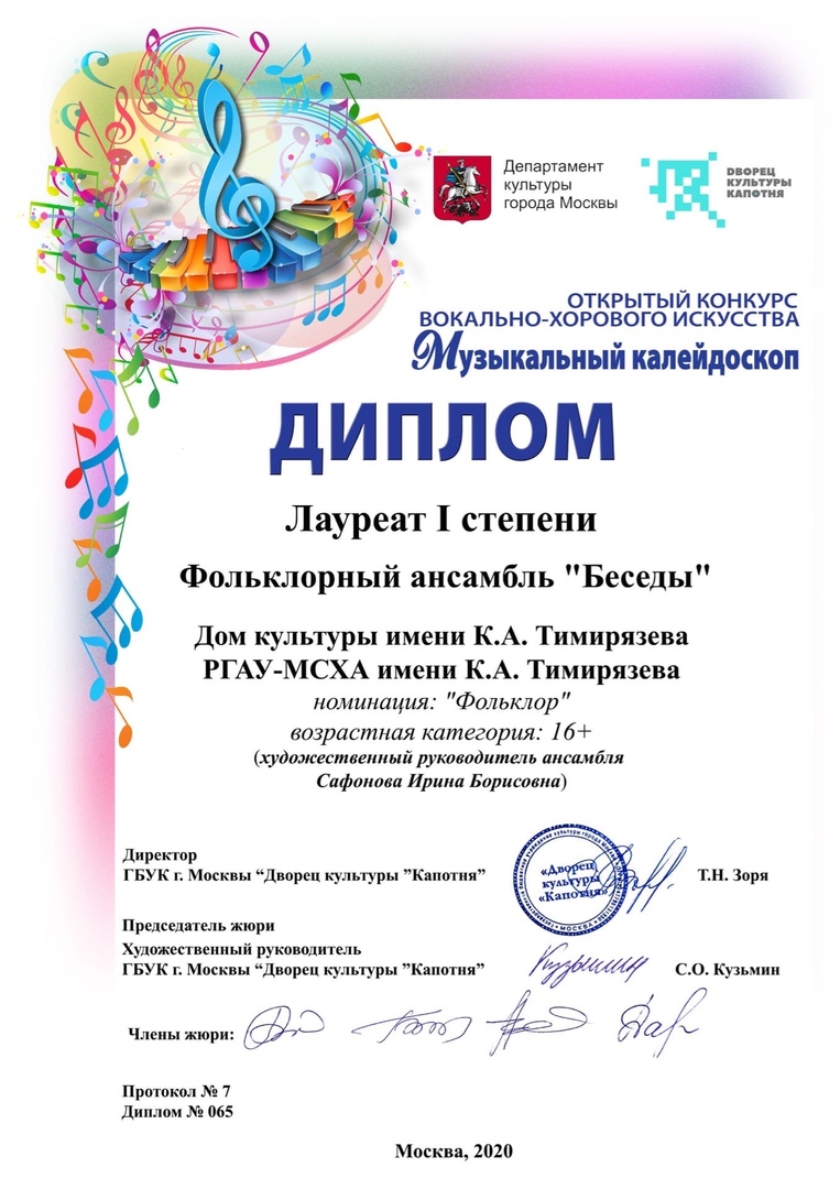 Тимирязевский фольклорный ансамбль «Беседы» принял участие в Открытом заочном конкурсе вокально-хорового искусства «Музыкальный калейдоскоп». Жюри конкурса высоко оценило выступления музыкального коллектива и присудило ему Диплом Лауреата I степени.