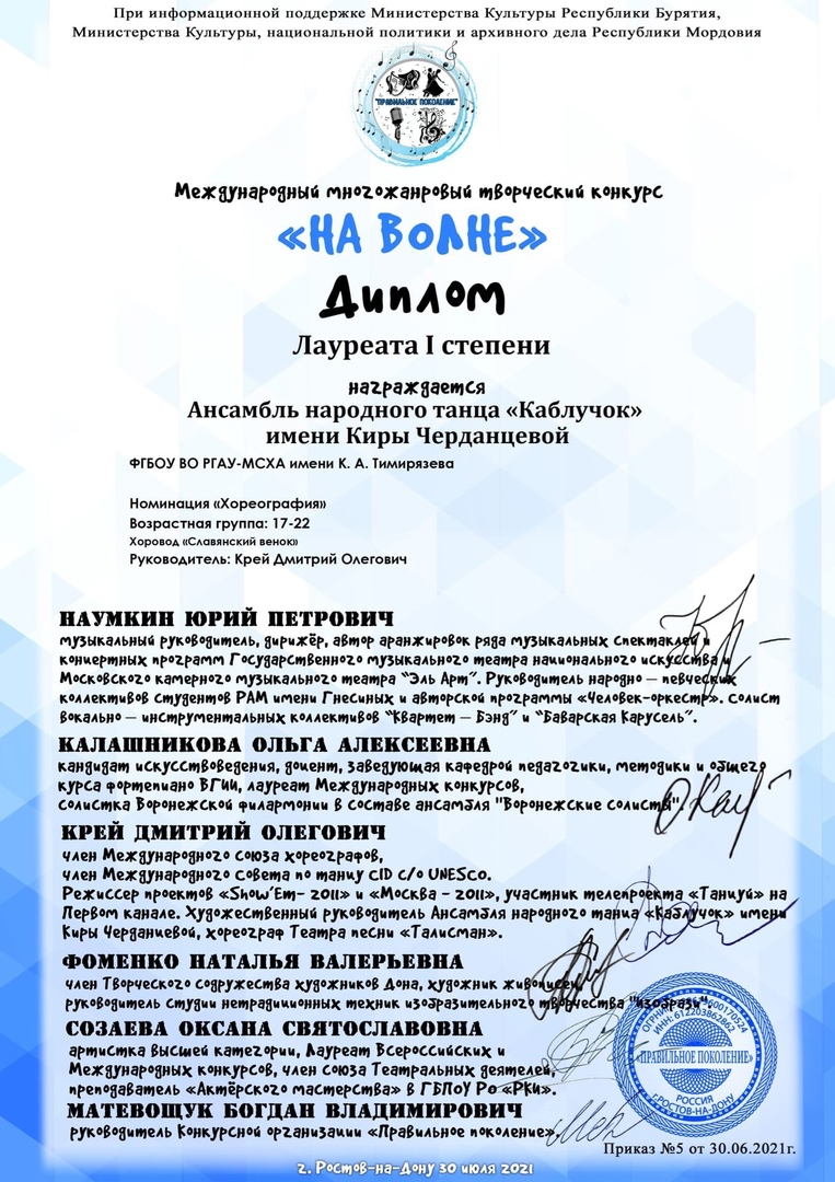 Ансамбль народного танца «Каблучок» имени К.П. Черданцевой принял участие в Международном многожанровом творческом конкурсе «На волне». Название творческого соревнования оказалось символичным для тимирязевцев – коллектив стал победителем.