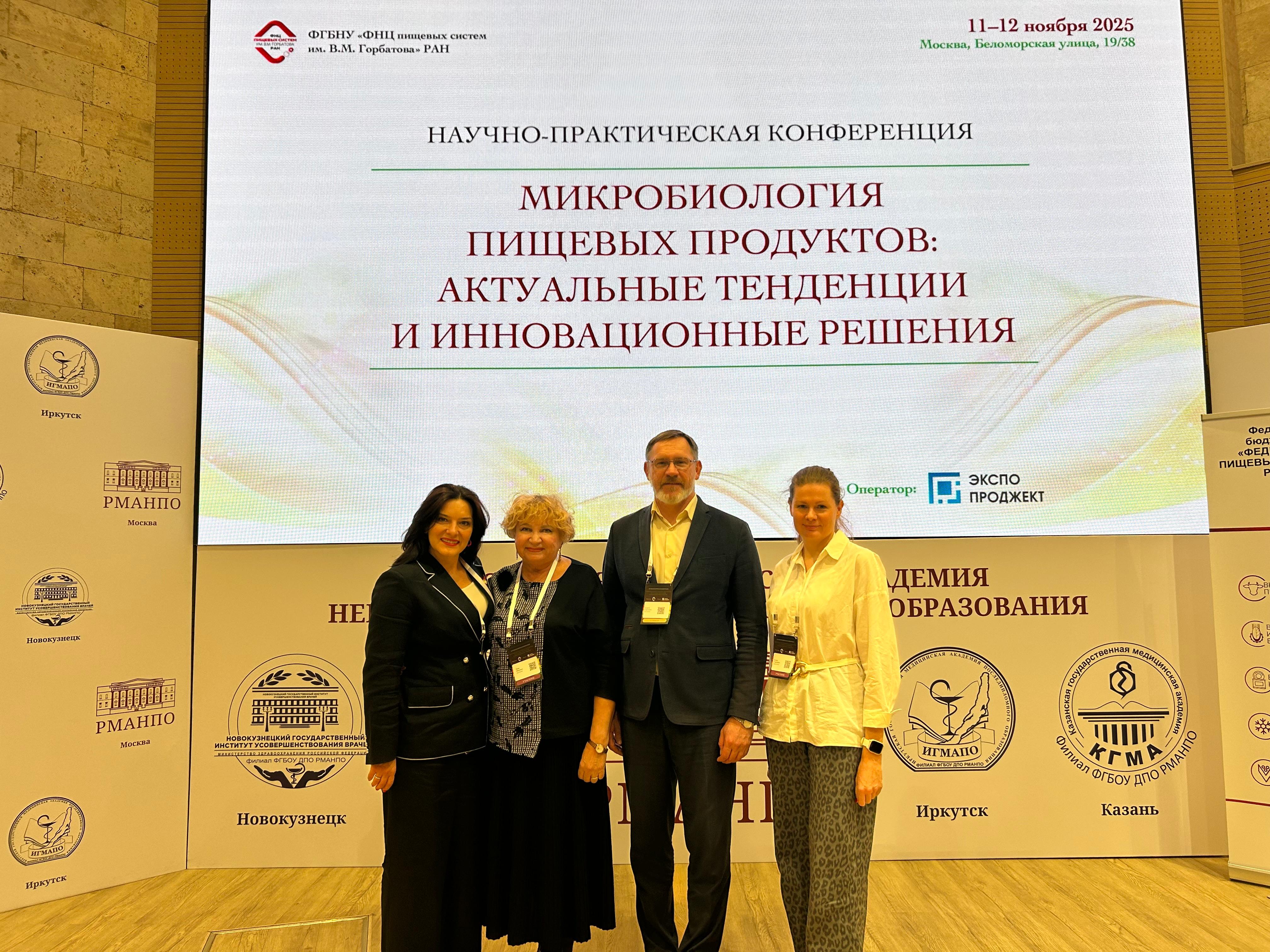 04 Декабрь / 2025Преподаватели ДПП ПП «Администратор баз данных перерабатывающих производств» д.т.н., профессор Дунченко Н.И. и к.т.н., доцент Волошина Е.С. совместно со студентами технологического института приняли участие в Международной научно-практической конференции «Пищевая микробиология: актуальные тенденции и инновационные решения». Визит состоялся по приглашению руководителя лаборатории микробиологии, заместителя руководителя испытательного центра ФГБНУ «ФНЦ пищевых систем им. В.М. Горбатова» РАН, д.т.н. Юшиной Ю.К.