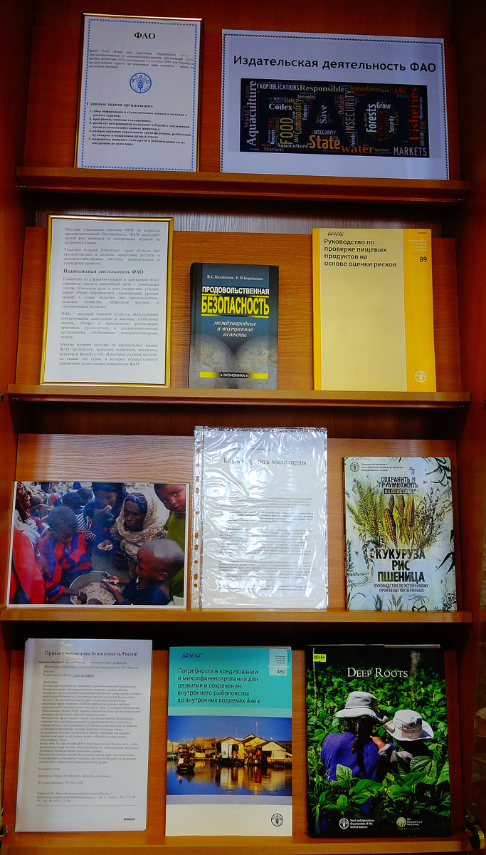 В Центральной научной библиотеке имени Н.И. Железнова открылась развернутая выставка, посвященная издательской деятельности Продовольственной и сельскохозяйственной организации ООН (ФАО). На ней представлены издания ФАО, статьи ученых академии со ссылками на данные ФАО, материалы об организации.