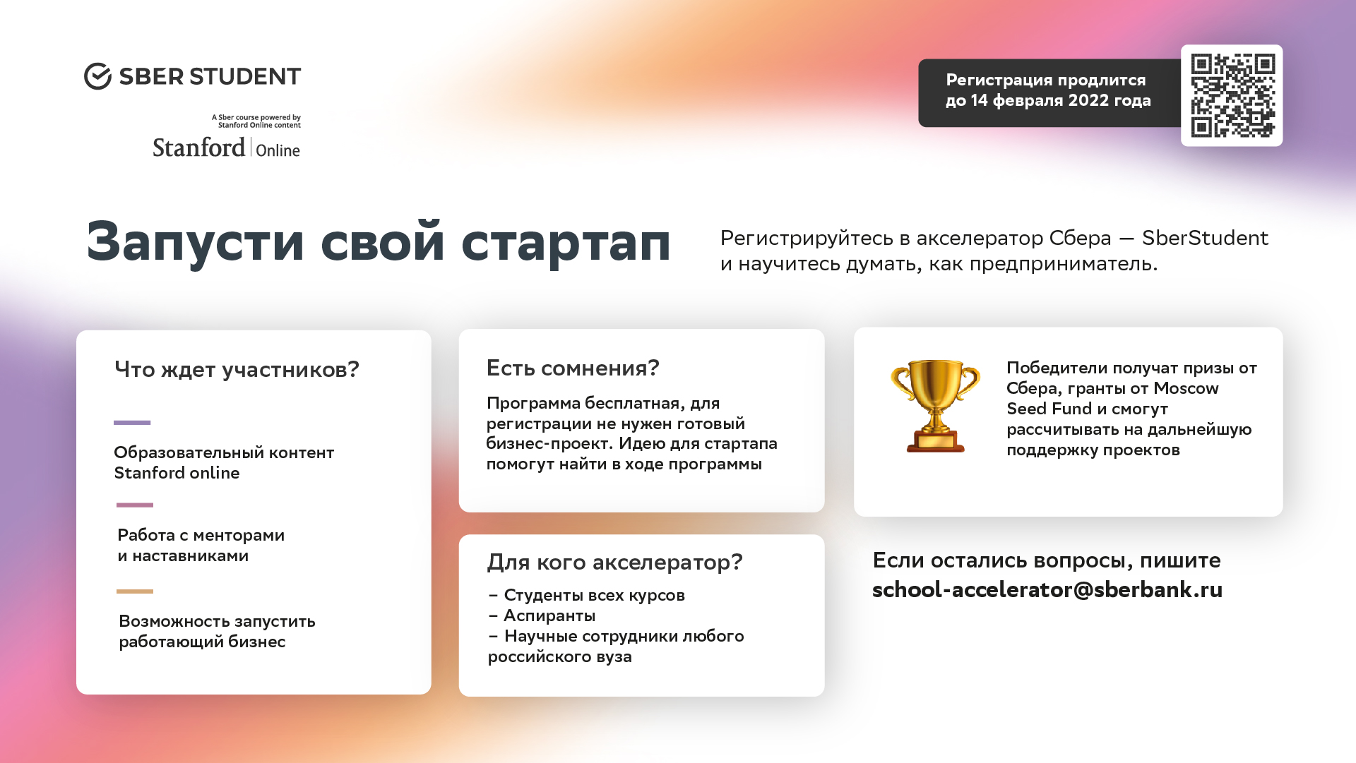 02 Февраль / 2022Регистрация на акселераторы открыта до 14 февраля включительно по ссылке: http://sber.me/?p=KBR89