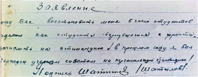 В этом же батальоне служил студент IV курса агрономического факультета Иван Семенович Шатилов. Сержант И.С. Шатилов был зачислен истребителем танков, а затем минометчиком 881-го полка, участвовал в боях северо-западнее Ржева в прорыве глубоко эшелонированной обороны противника, в захвате знамени полка и документов штаба немецкой дивизии. В 1943 г. И.С. Шатилов в числе других призванных студентов был демобилизован для продолжения учебы в академии, в 1944 г. с отличием ее окончил и был оставлен в аспирантуре при кафедре растениеводства.