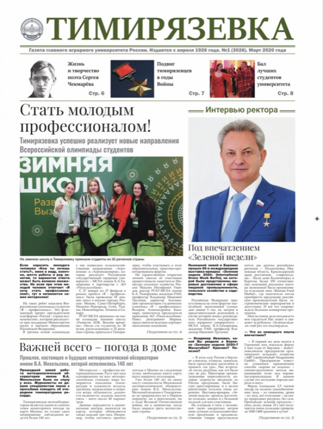 В свежем выпуске размещено интервью ректора, Академика РАН, профессора В.И. Трухачева о посещении международной выставки-ярмарки «Зеленая неделя» в Берлине. Материалы номера посвящены работе Метеообсерватории имени В.А. Михельсона, проведению Зимней школы «Развитие АПК. Вызовы времени», выпускникам университета – героям Великой Отечественной войны, творчеству поэта-тимирязевца Сергея Чекмарева, прошедшему Балу лучших студентов и другим интересным темам.