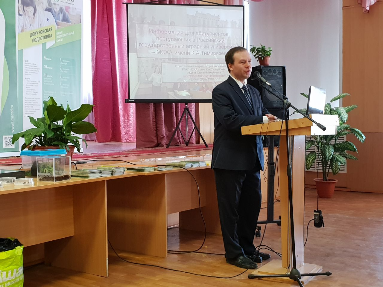 Ответственный секретарь приемной комиссии Сергей Авдеев рассказал старшеклассникам о направлениях подготовки, по которым идет набор в Тимирязевку. Их очень обрадовало большое количестве бюджетных мест - 1814 (без учета магистратуры). Сергей Авдеев подробно рассказал о правилах приема и условиях целевого набора на бюджетные места (на каждое направление подготовки выделяется квота для организаций, заинтересованных в будущем специалисте).