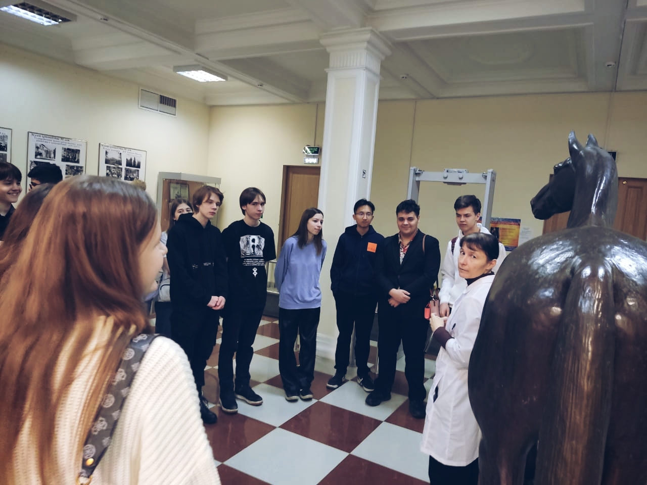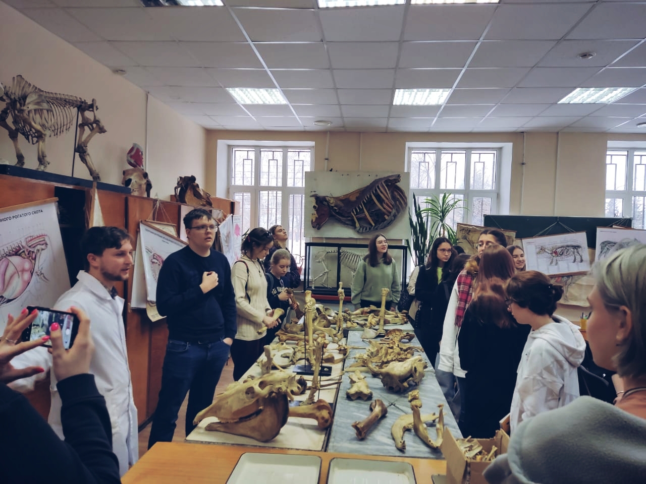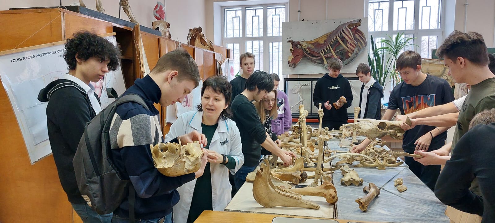 И.о. заведующего кафедрой А.Э. Семак провела для ребят ознакомительное экскурсионное занятие в экспозиции Музея анатомии, где рассказала ребятам об особенностях строения сельскохозяйственных животных на различных уровнях организации.