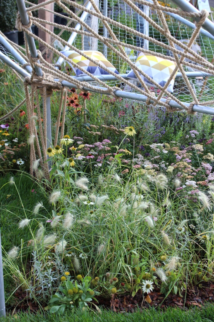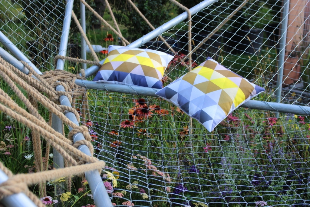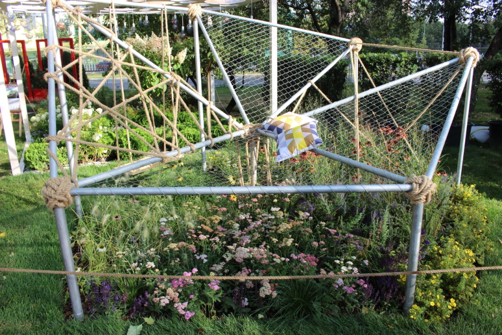 Так серебряной медали был удостоен проект «Сад под ногами». Его авторами стали студентки Тамара Гагкоева и Мария Мухина. Под руководством заведующего кафедрой ландшафтной архитектуры Александра Довганюка им удалось создать инновационную конструкцию для отдыха. Она состоит из разноуровневых секций, где натянута сеть, есть качели и канат. Любители активных игр смогли забраться на самую верхнюю точку модели.