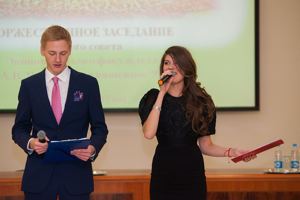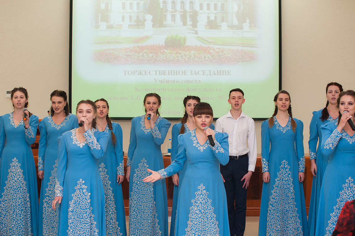 Начало официальной части торжественного заседания Ученого совета ознаменовал гимн экономического факультета. В переработке песни «Москва майская» на стихи Василия Лебедева-Кумача его исполнили студенты — участники ансамбля художественной самодеятельности.