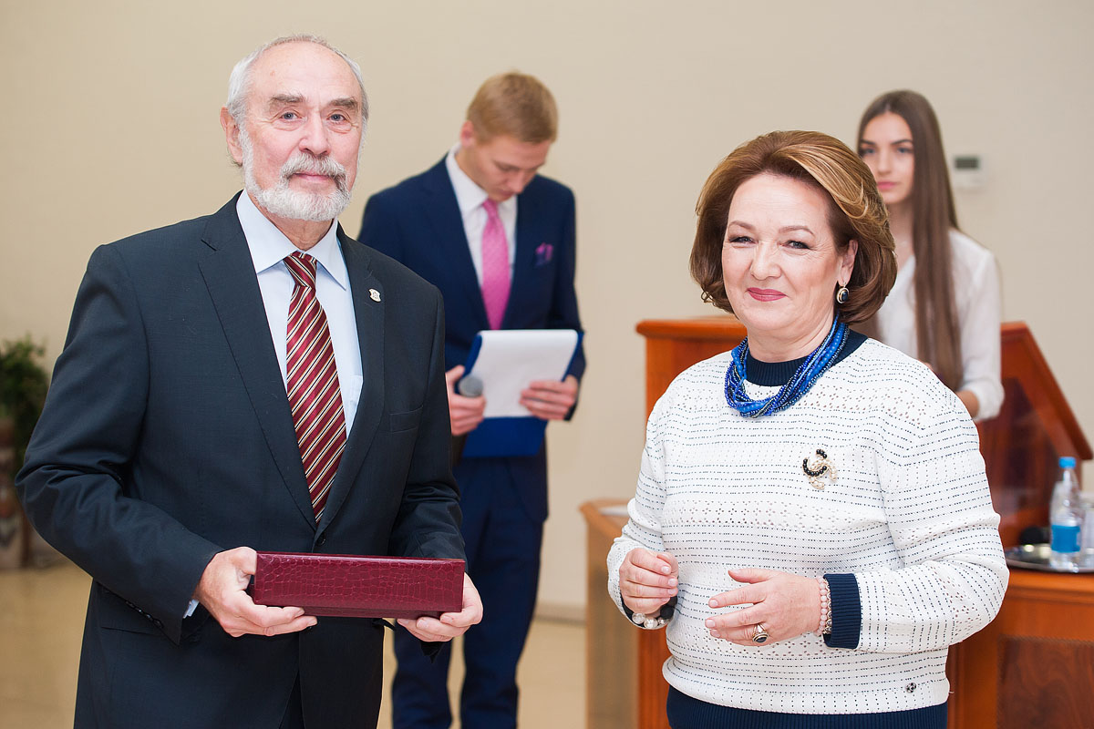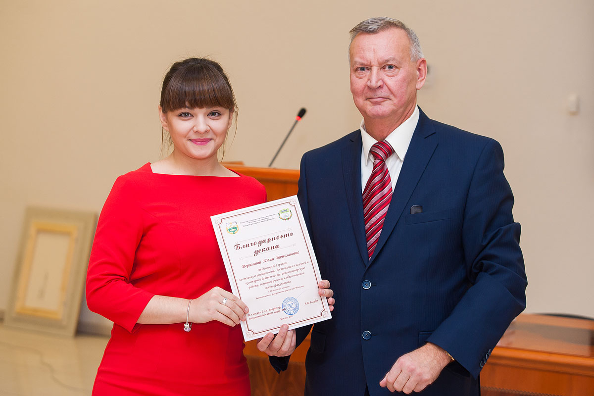 На Ученом совете факультета наряду с добрыми поздравлениями и выступлениями студенческой художественной самодеятельности состоялось вручение ведущим специалистам факультета ведомственных наград — благодарностей Минсельхоза России и именных часов главы аграрного ведомства страны А.Н. Ткачева.