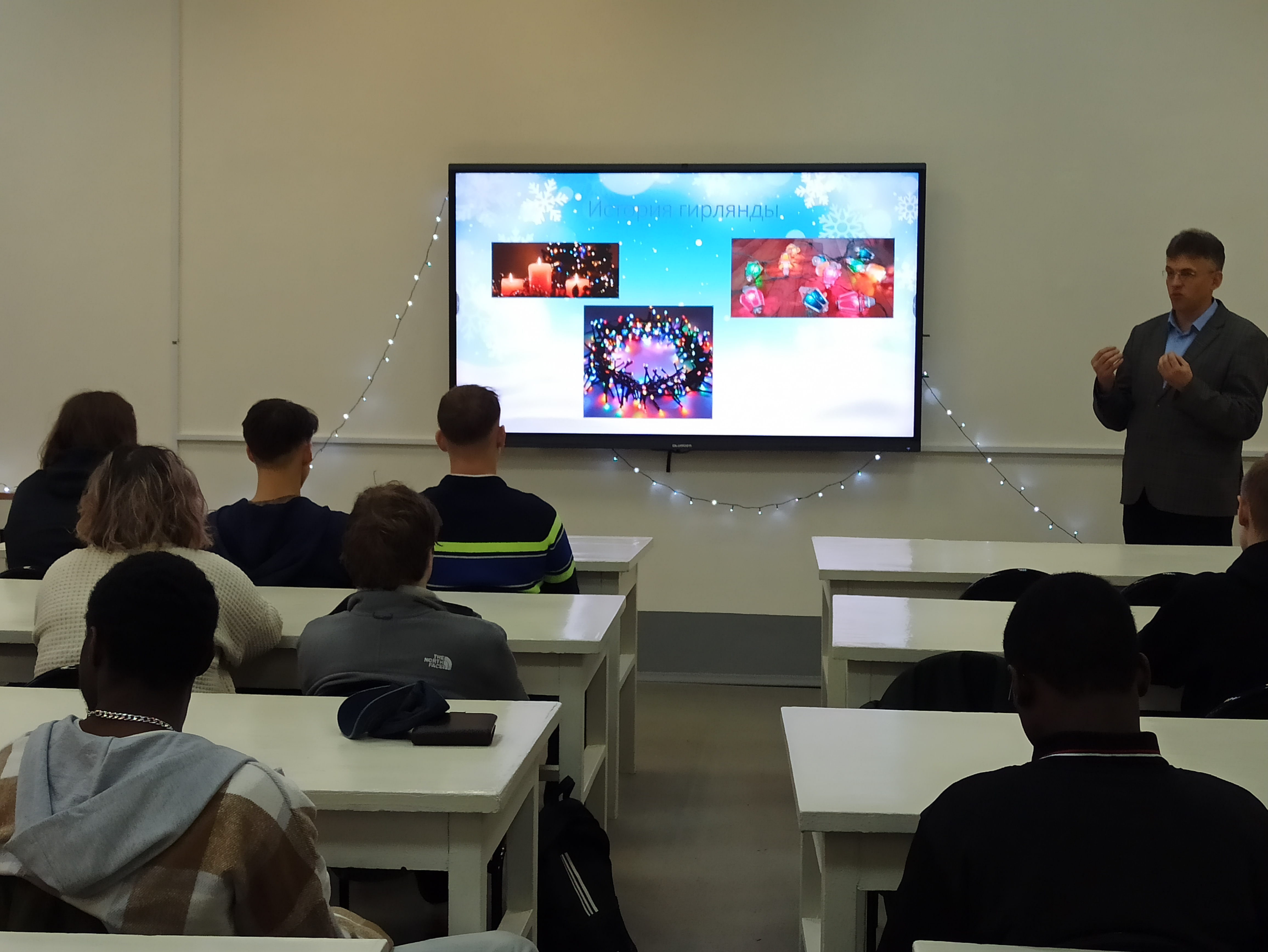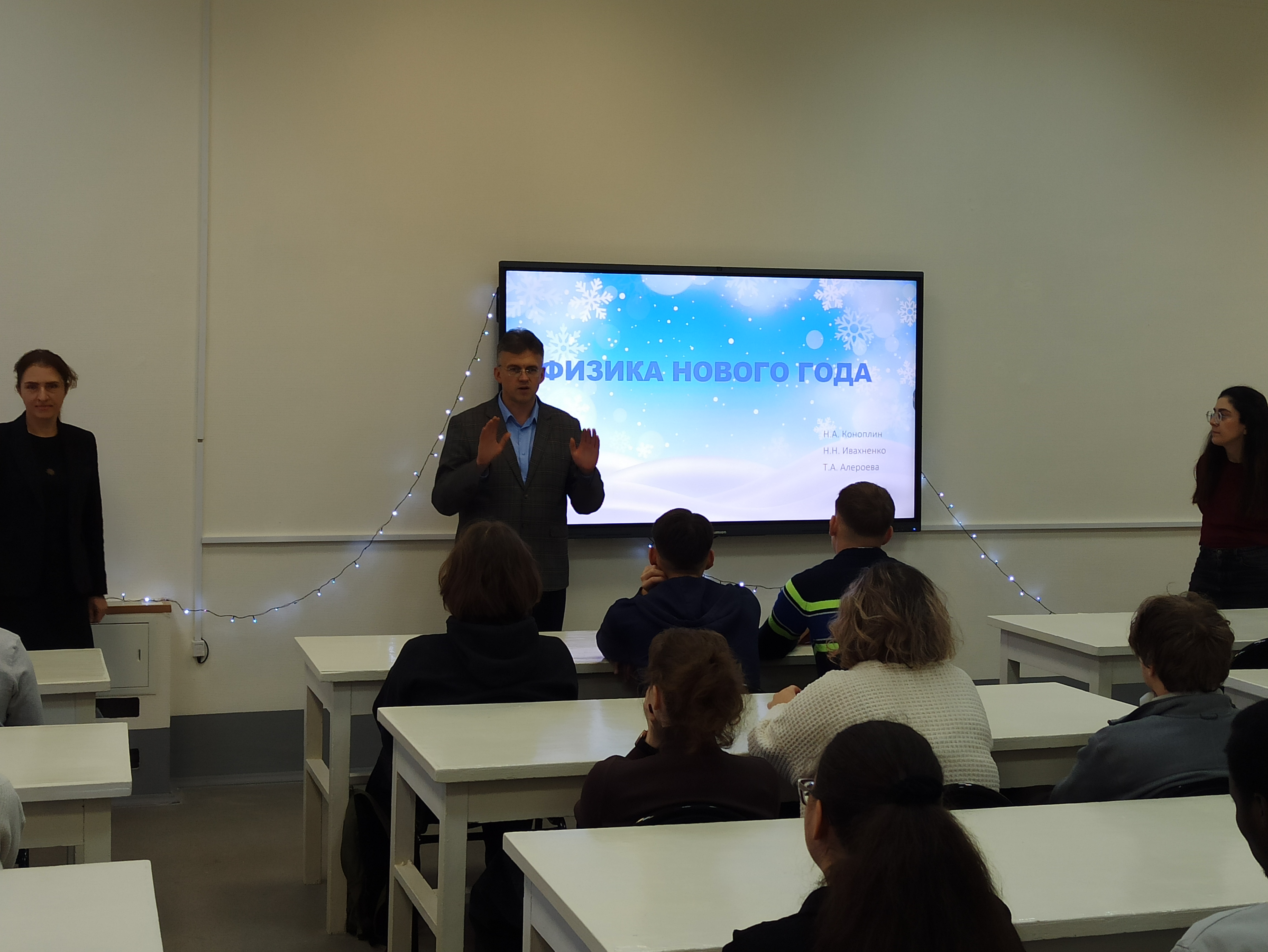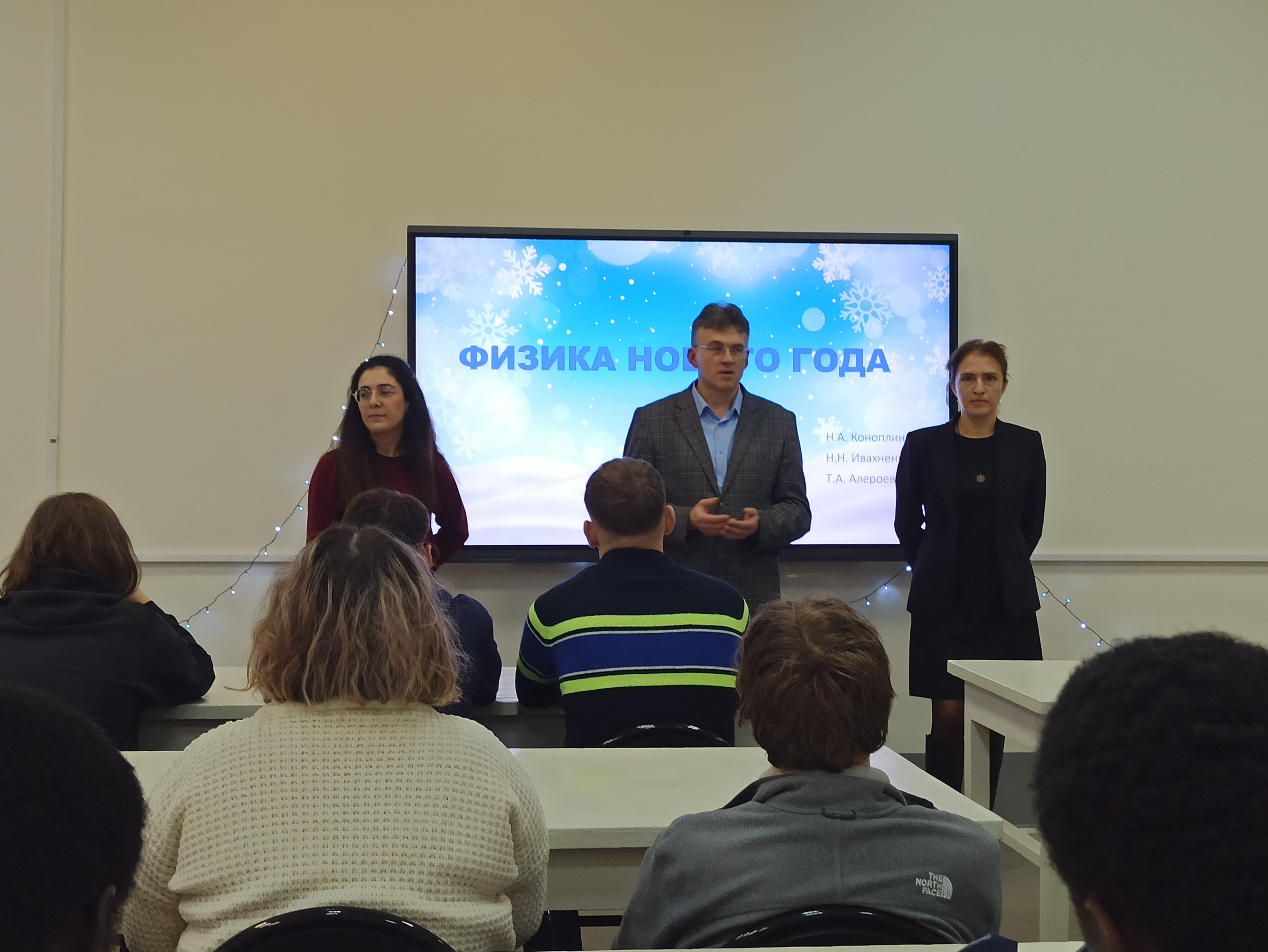 18 декабря 2025 года на кафедре физики состоялось не совсем обычное занятие. В преддверии наступающего Нового года преподаватели кафедры Н. А. Коноплин, Н. Н. Ивахненко и Т. А. Алероева провели для студентов культурно-просветительскую лекцию - "Физика Нового года".