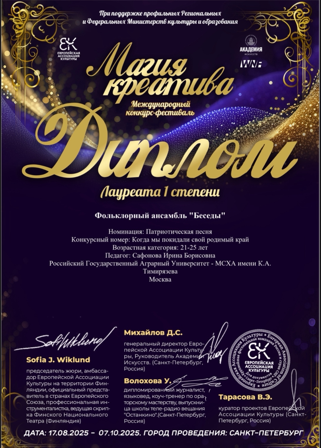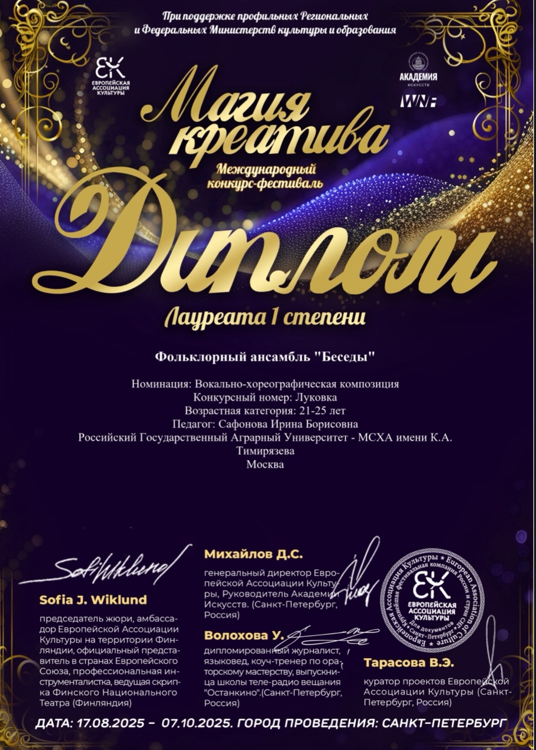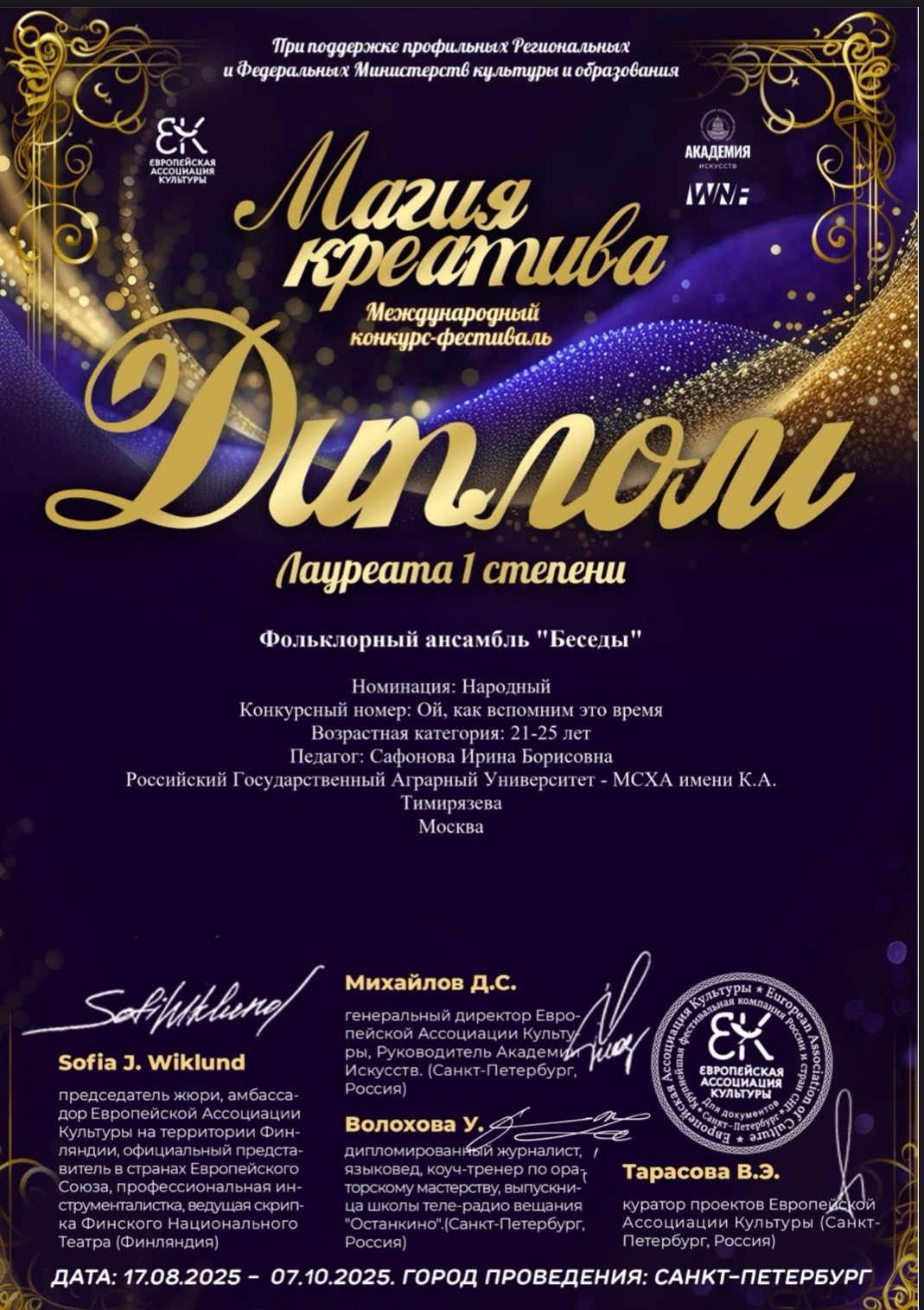 Фольклорный ансамбль «Беседы» Российского государственного аграрного университета – МСХА имени К.А. Тимирязева вновь подтвердил свой высокий уровень мастерства, завоевав признание на Международном конкурсе-фестивале «Магия креатива». Мероприятие, организованное Европейской ассоциацией культуры при поддержке Федеральных Министерств культуры и образования, стало площадкой для демонстрации талантов из разных регионов России и зарубежья.